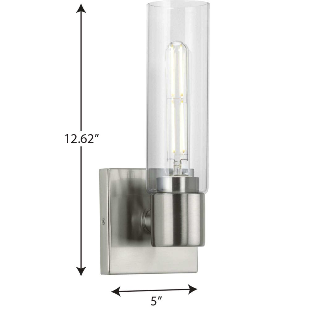 Application: Embrace minimalist simplicity with the Clarion Collection 1-Light Brushed Nickel Clear Glass Modern Bath Vanity Light ideal for any entryway, hallway, foyer, bedroom, sitting room, or bathroom.;Style: Perfect for contemporary, modern, and tran
