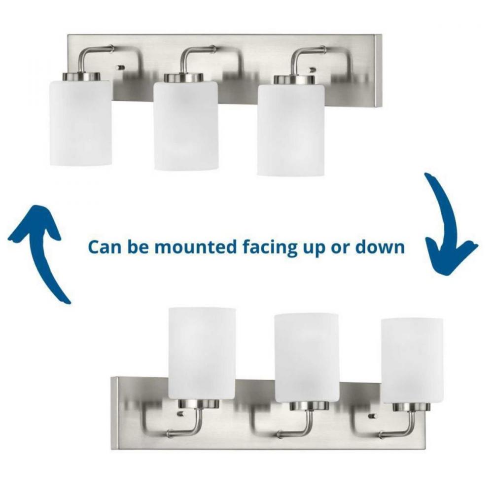 Incorporate a clean, contemporary design with the Merry Collection 3-Light Etched Glass Brushed Nickel Transitional Bath Vanity Light. Light sources glow from within crisp etched glass shades for a generous elegant glow sure to transform any bath into a modern retreat. The rectangular backplate, curved arms, and round light bases are coated in a beautiful brushed nickel finish that perfectly blends transitional and modern character. For ideal illumination, use 3 medium base bulbs that are sold separately (100w max - LED/CFL/incandescent). The bath light is compatible with dimmable bulbs. The bath vanity light's contemporary design is ideal for any bathroom in modern and transitional style settings. It's time to breathe new life into the mundane every day with timeless and truly transformative lighting. Make your purchase today to begin your journey to a whole new lighting experience. Progress Lighting products are designed for exceptional quality, reliability, and functionality.