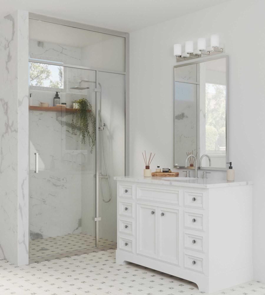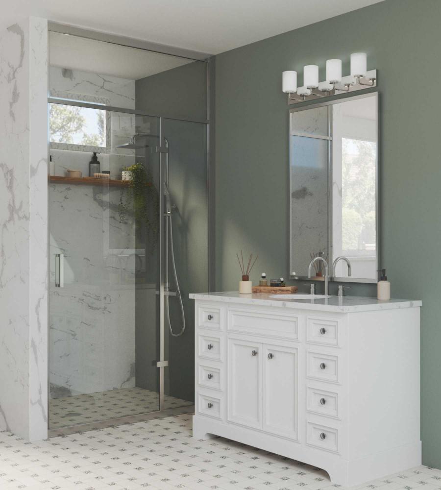 Incorporate a clean, contemporary design with the Merry Collection 4-Light Etched Glass Polished Chrome Transitional Bath Vanity Light. Light sources glow from within crisp etched glass shades for a generous elegant glow sure to transform any bath into a modern retreat. The rectangular backplate, curved arms, and round light bases are coated in a beautiful polished chrome finish that perfectly blends transitional and modern character. For ideal illumination, use 4 medium base bulbs that are sold separately (100w max - LED/CFL/incandescent). The bath light is compatible with dimmable bulbs. The bath vanity light's contemporary design is ideal for any bathroom in modern and transitional style settings. It's time to breathe new life into the mundane every day with timeless and truly transformative lighting. Make your purchase today to begin your journey to a whole new lighting experience. Progress Lighting products are designed for exceptional quality, reliability, and functionality.