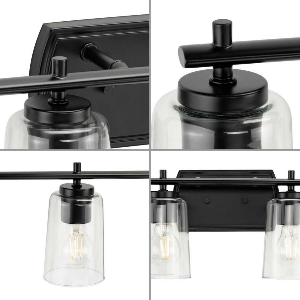 Fundamentally modern but with a traditional twist, the Adley vanity light combines clear glass shades with a curved edge backplate and a simple, straight bar finished in crisp matte black. This light is an elegant choice for illuminating new traditional and transitional settings.