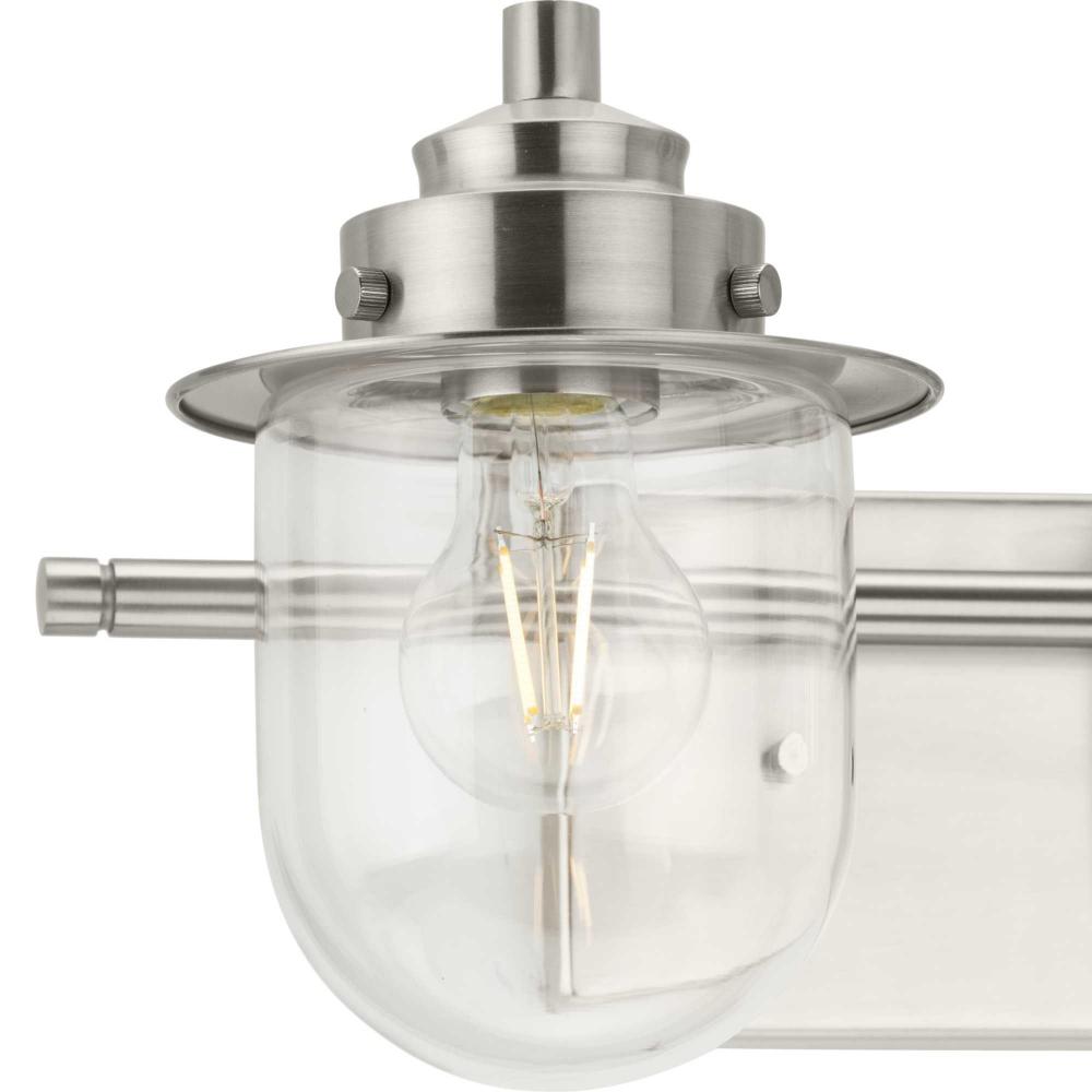 The nostalgic Northlake Collection combines classic design influences with nautical inspiration. Finished in brushed nickel, the rounded diffuser and layered caps are reminiscent of floating buoys and weekends on a mountain lake. Clear glass shades cast a pleasing glow in bathrooms and powder rooms in coastal and transitional settings. This versatile fixture can be mounted up or down, increasing its design flexibility. It is cULus damp rated and has a one-year warranty to guarantee your complete satisfaction. Progress Lighting products offer exceptional quality, reliability, and functionality. .