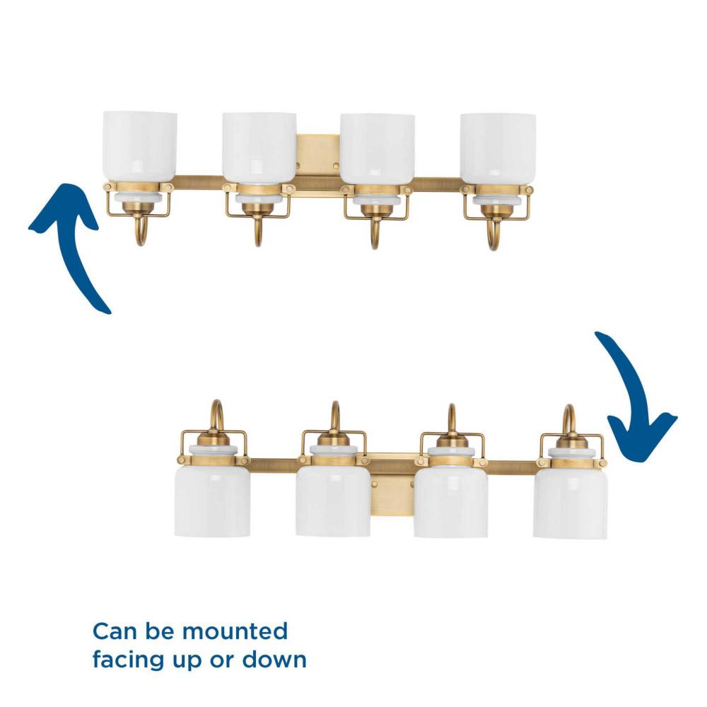 Distinctive mechanical details establish a nostalgic flair in the elegant Fessler collection. Opal glass shades deliver comfortable diffuse illumination to bathrooms and powder rooms in transitional and farmhouse settings. The decorative frame is coated in a stately vintage brass and features authentically crafted hardware elements that complements the curved opal shades. This versatile fixture can be mounted up or down, increasing its design flexibility. It is cULus damp location listed, with a one-year warranty to guarantee your complete satisfaction. Progress Lighting products are designed for exceptional quality, reliability, and functionality. .