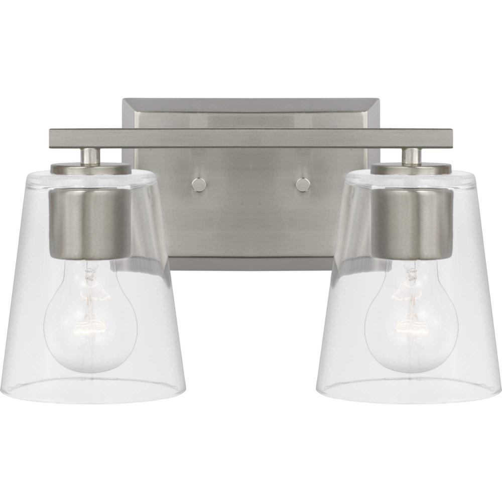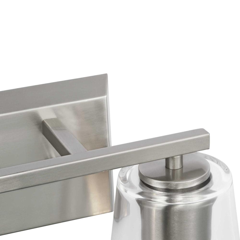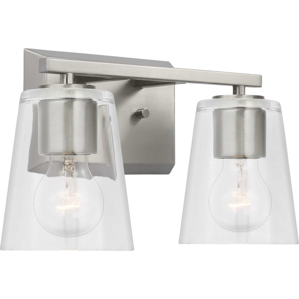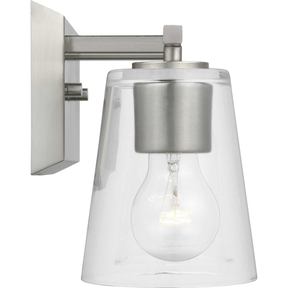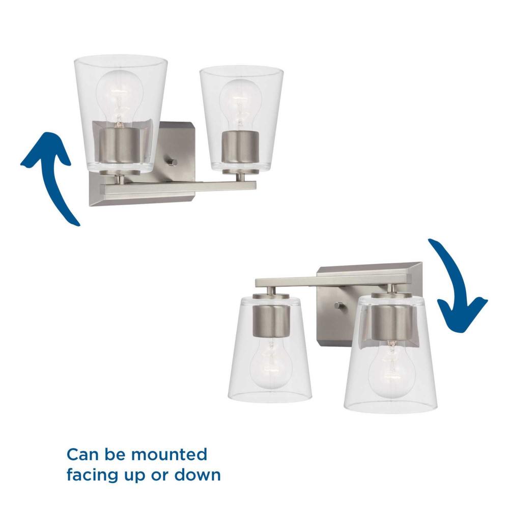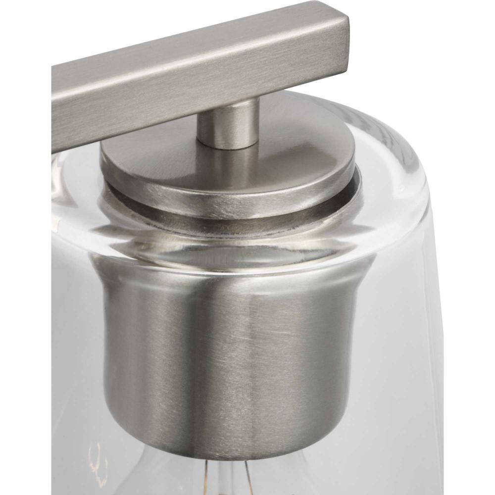 Elegantly extended, the Vertex Collection is composed of angular forms finished in subtle brushed nickel to create a bold design that perfectly complements modern interiors. Glass shades delivers bright illumination to bathrooms and powder rooms in contemporary settings. This versatile fixture can be mounted up or down, increasing its design flexibility. It is cULus damp rated and has a one-year warranty to guarantee your complete satisfaction. Progress Lighting products offer exceptional quality, reliability, and functionality. .