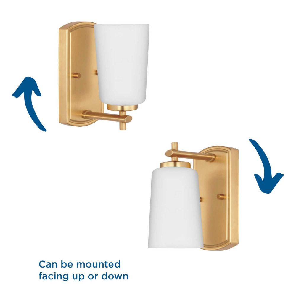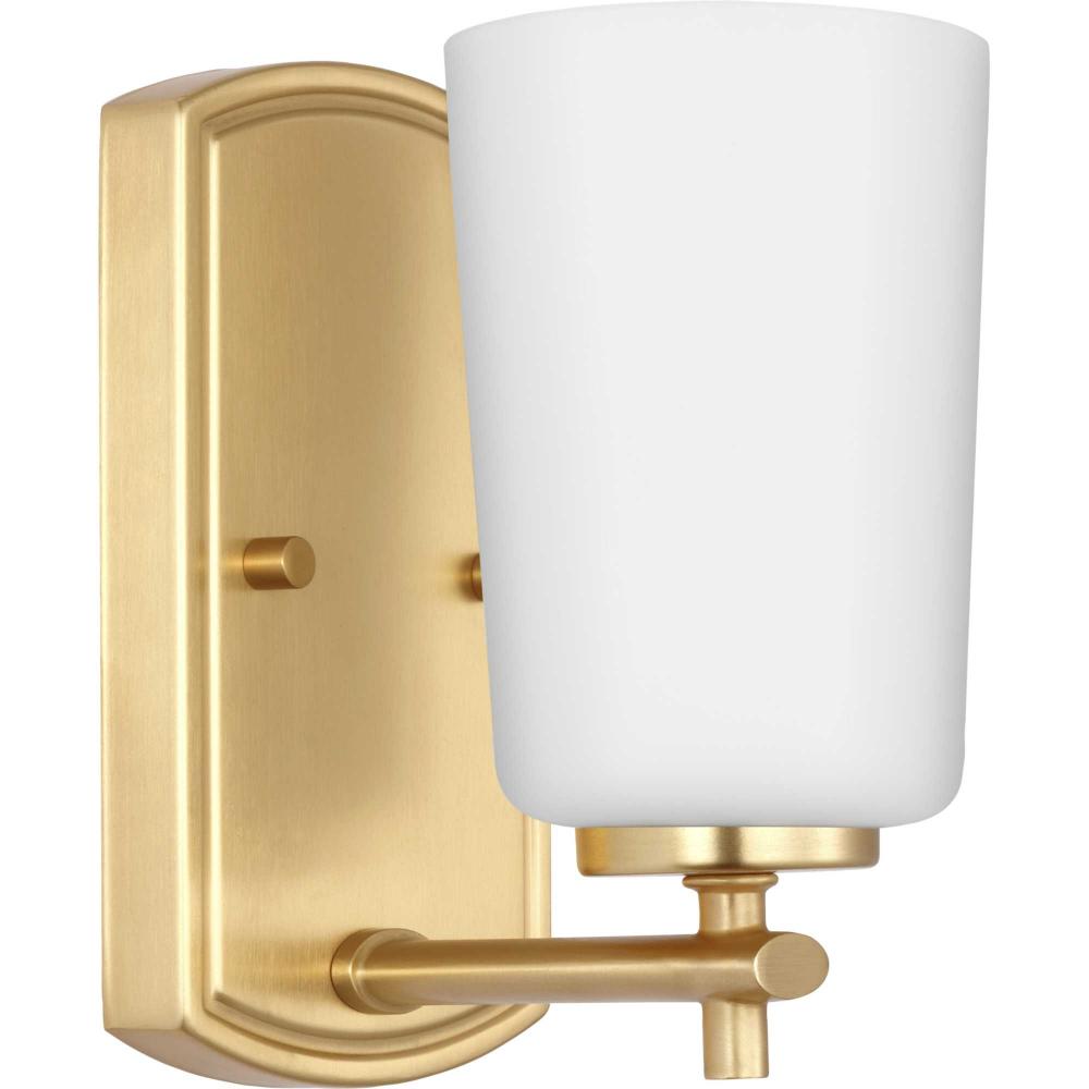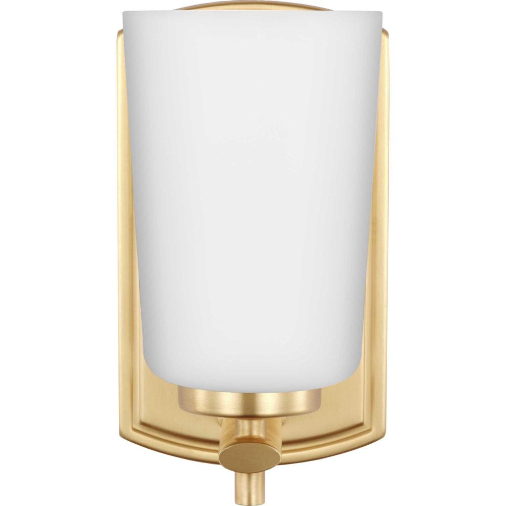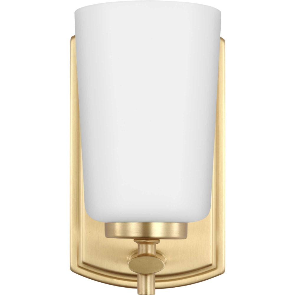 Fundamentally modern but with a traditional twist, the Adley vanity light combines an opal glass shade with a curved edge backplate and a simple, straight bar finished in lustrous satin brass. This light is an elegant choice for illuminating new traditional and transitional settings.