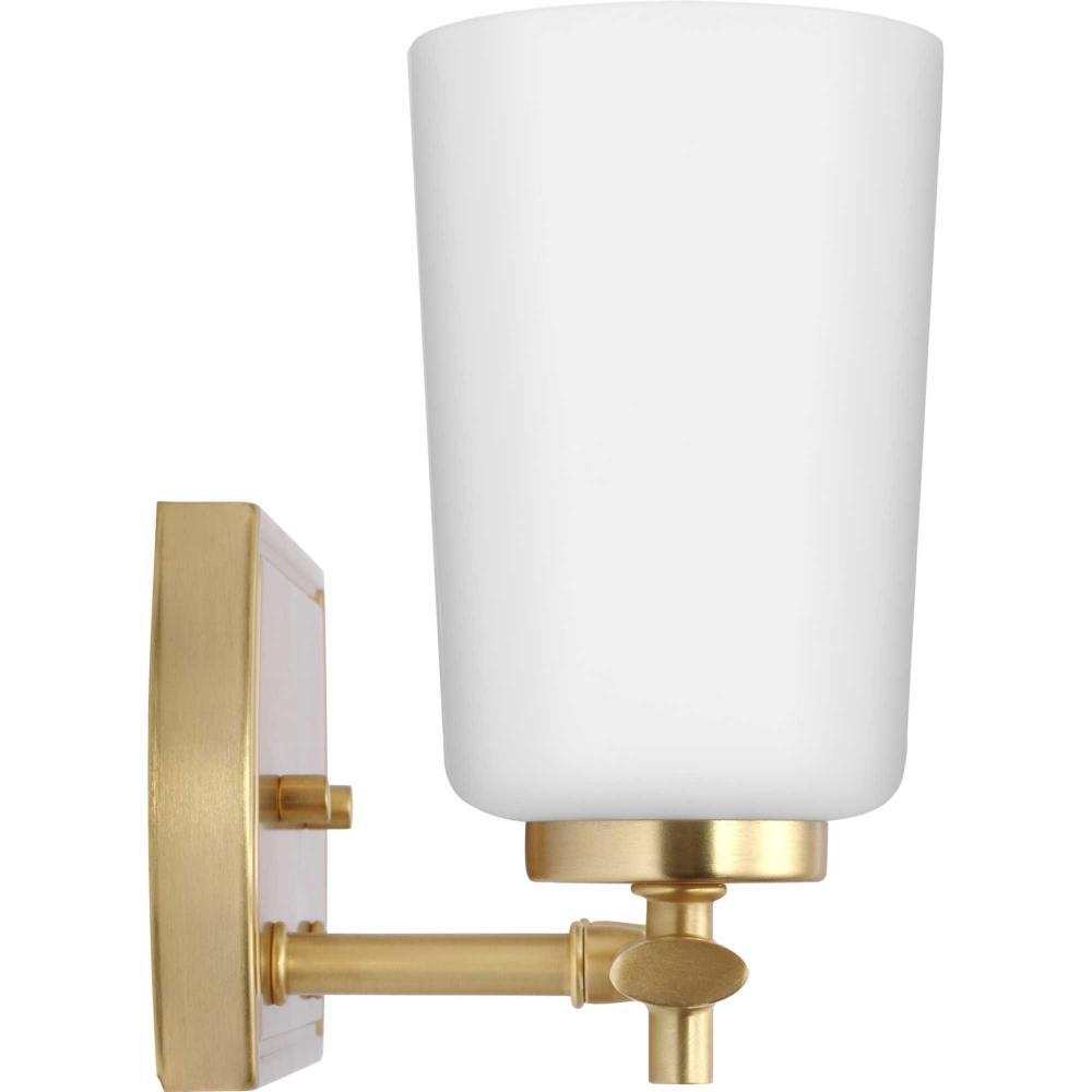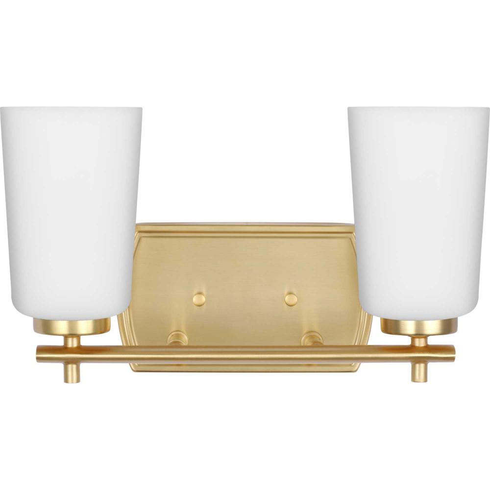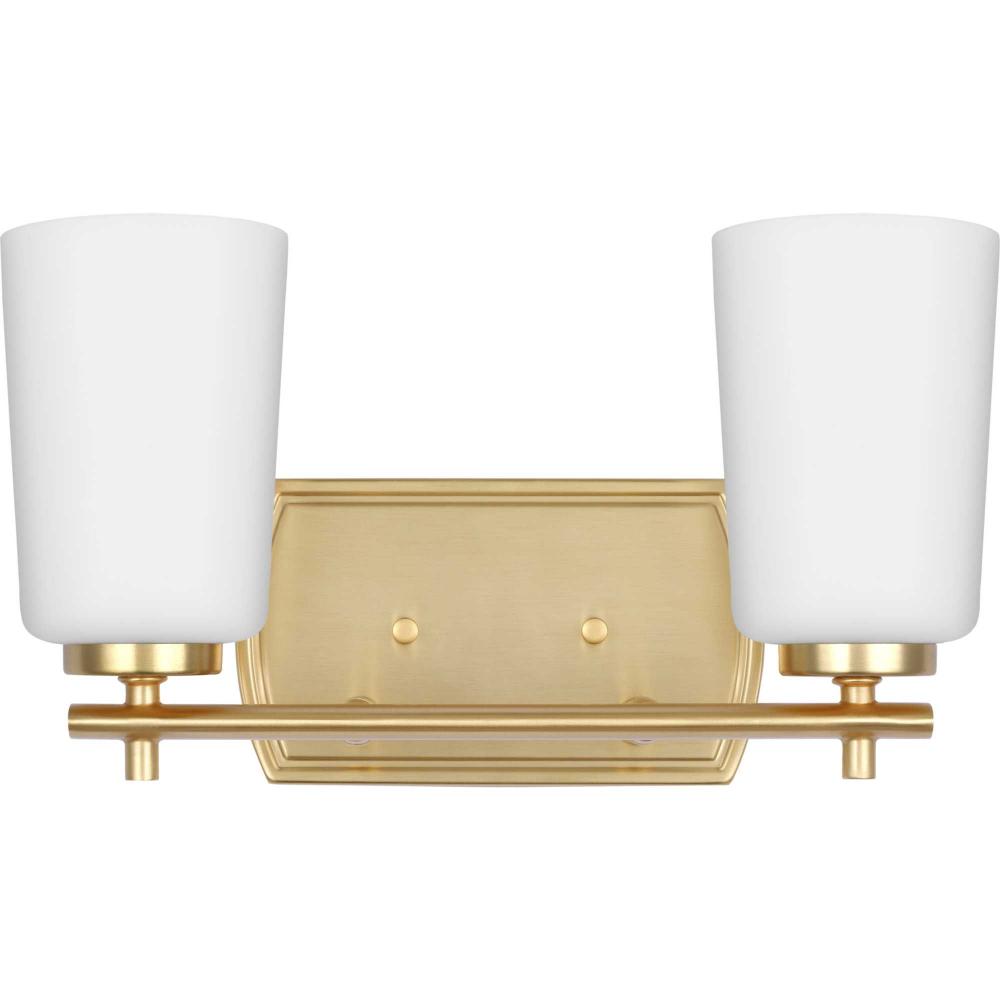 Fundamentally modern but with a traditional twist, the Adley vanity light combines opal glass shades with a curved edge backplate and a simple, straight bar finished in lustrous satin brass. This light is an elegant choice for illuminating new traditional and transitional settings.