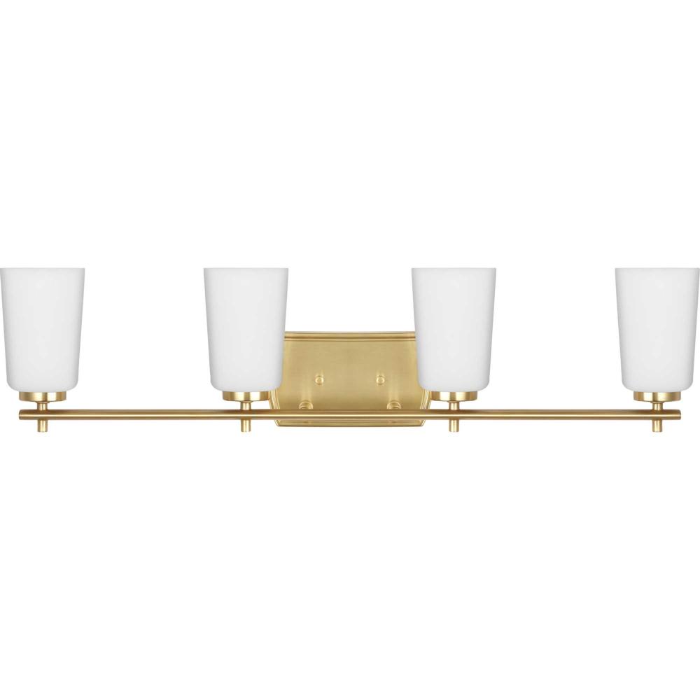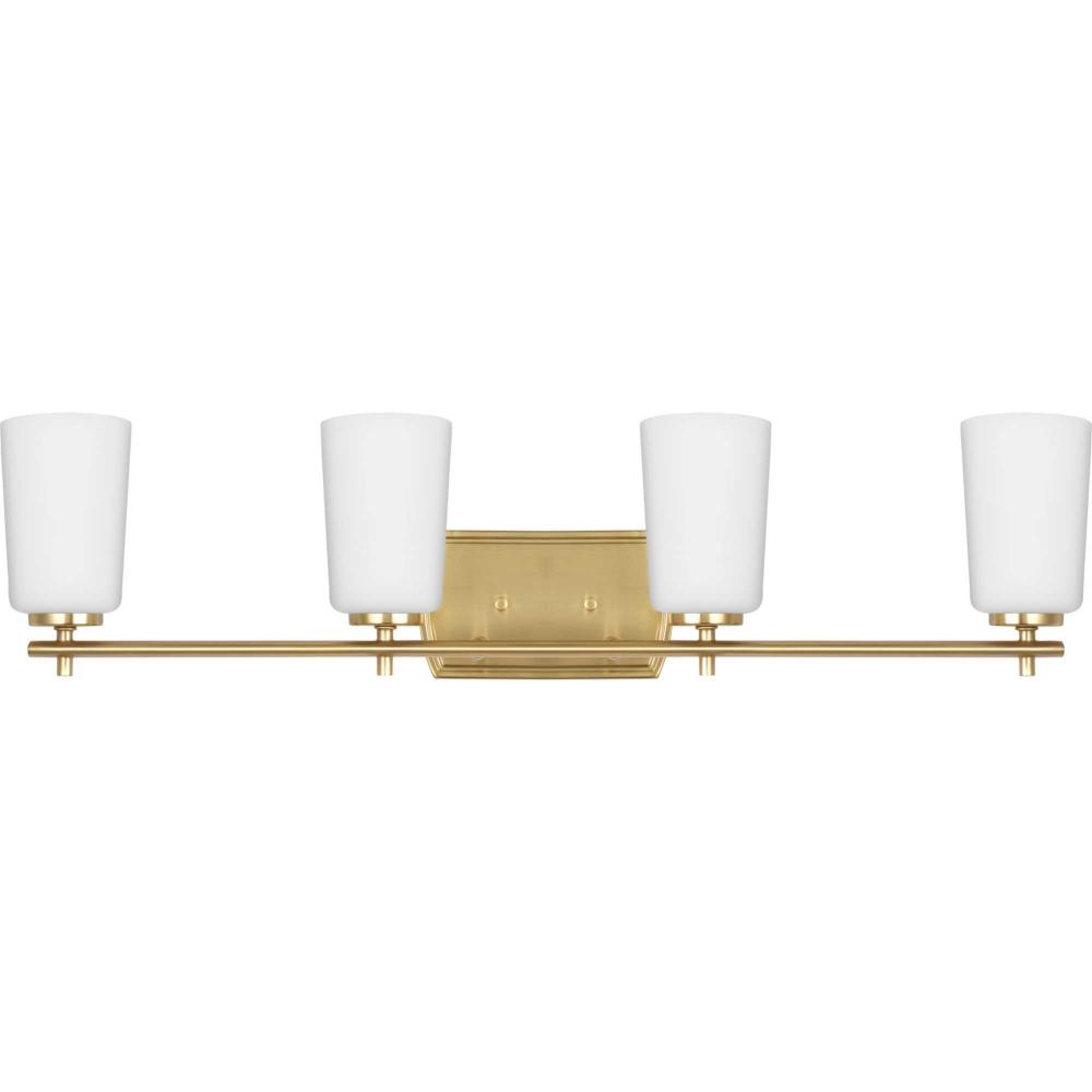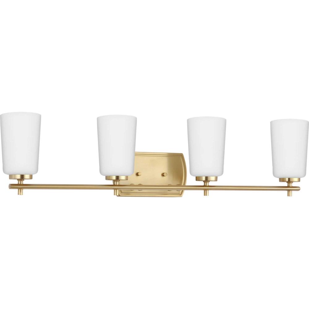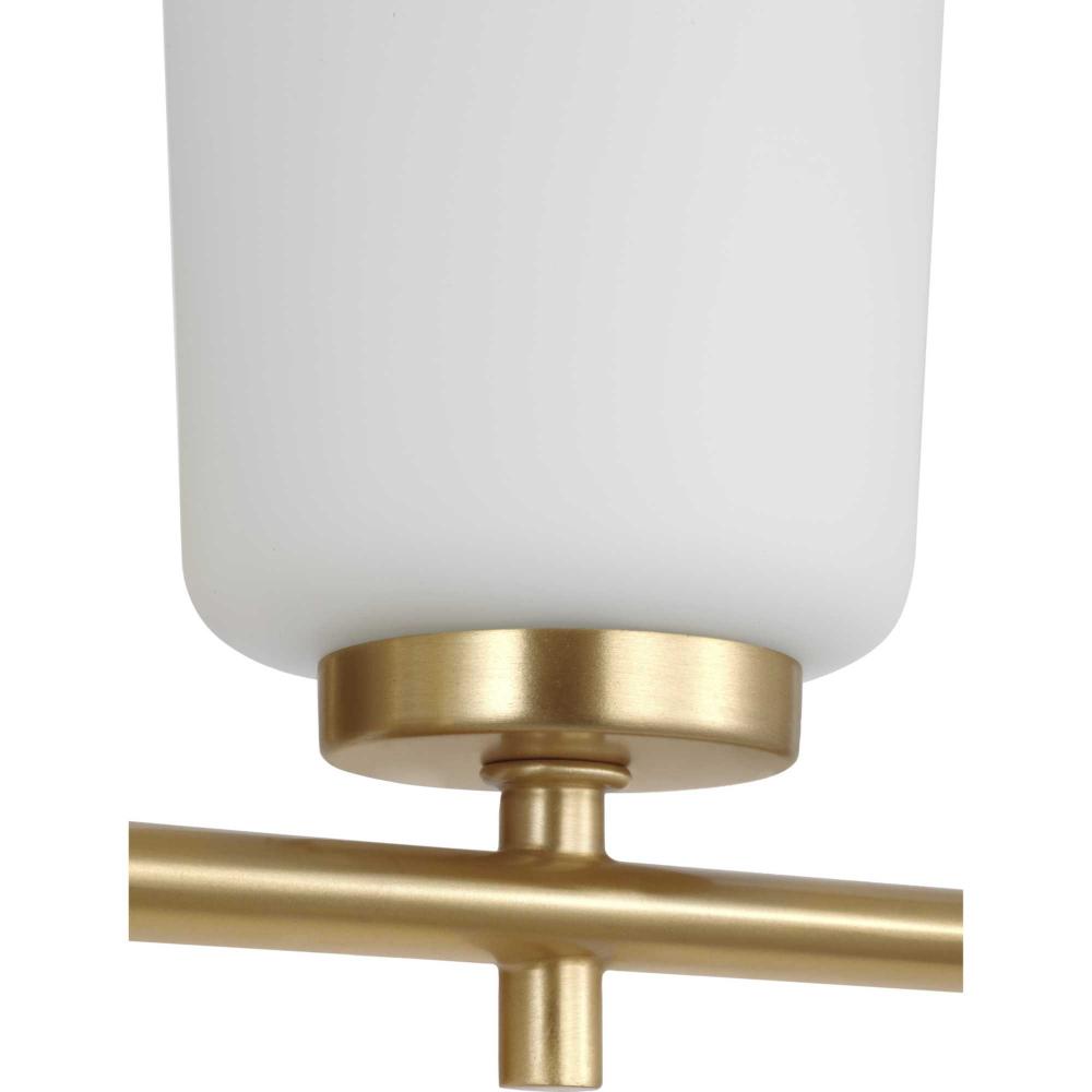 Fundamentally modern but with a traditional twist, the Adley vanity light combines opal glass shades with a curved edge backplate and a simple, straight bar finished in lustrous satin brass. This light is an elegant choice for illuminating new traditional and transitional settings.