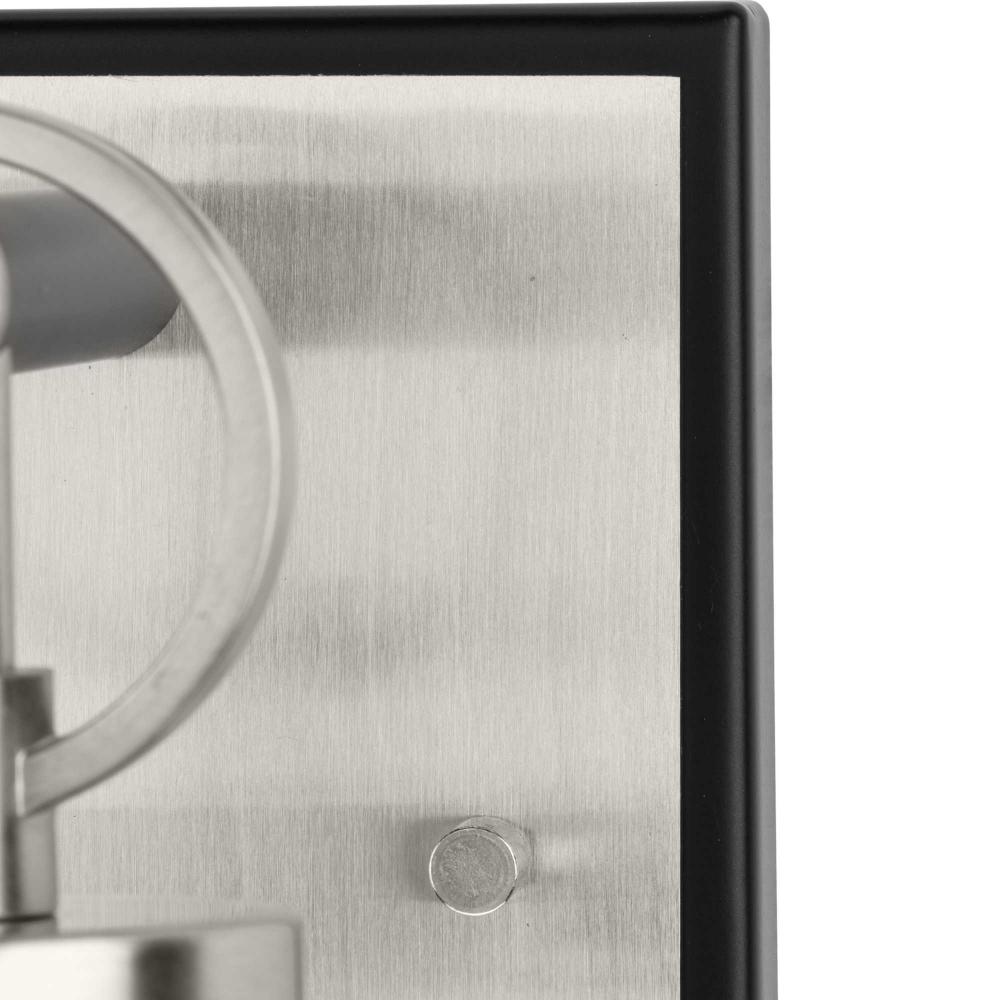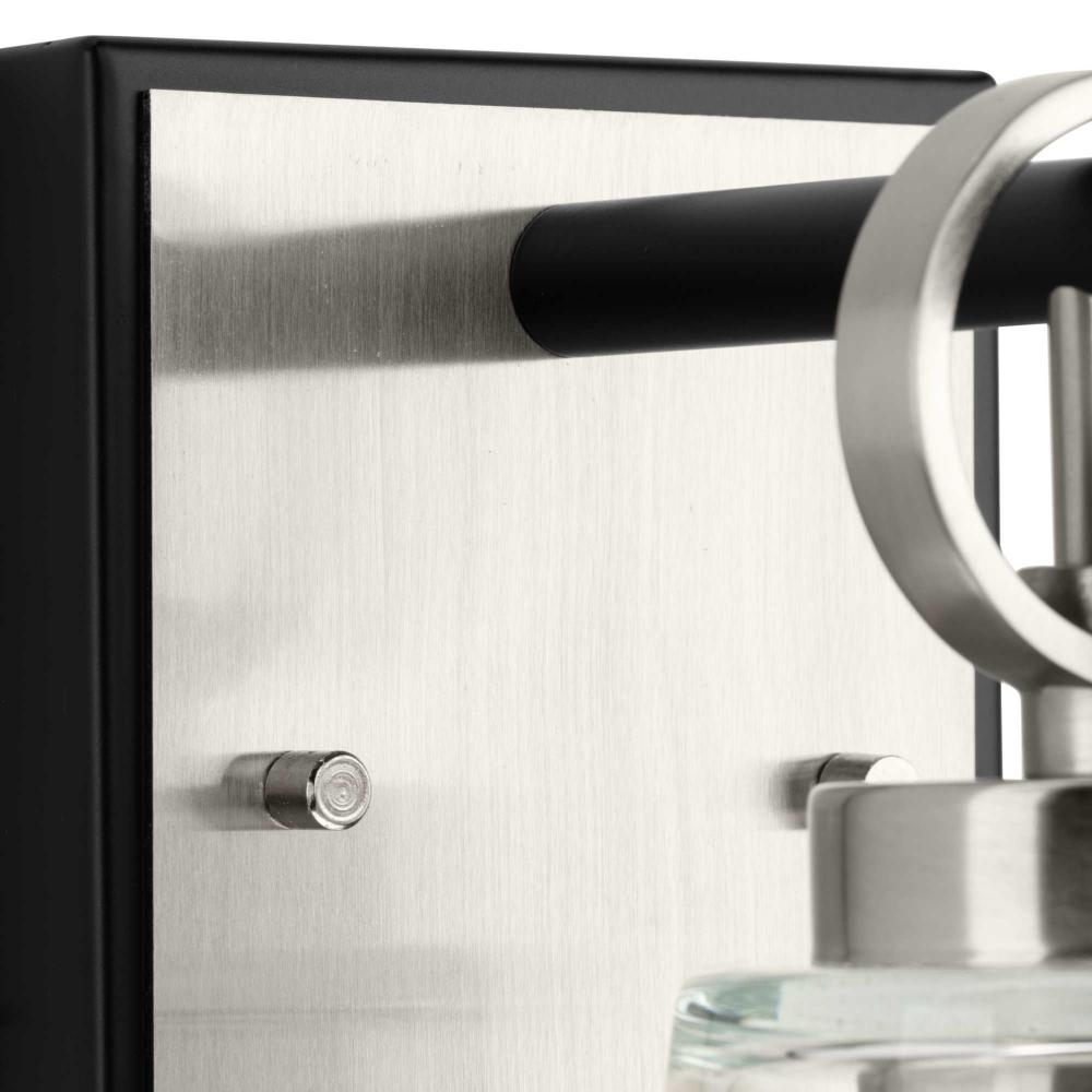 The Cassell One-Light Vanity Fixture brings an enduring style to the bath. The light boasts a dual-tone finish of Brushed Nickel and Matte Black that accentuates its distinguished and handsome design. Tailored details smoothly blend linear precision with an elegant circular ring and clear glass shade.