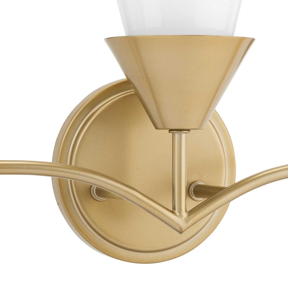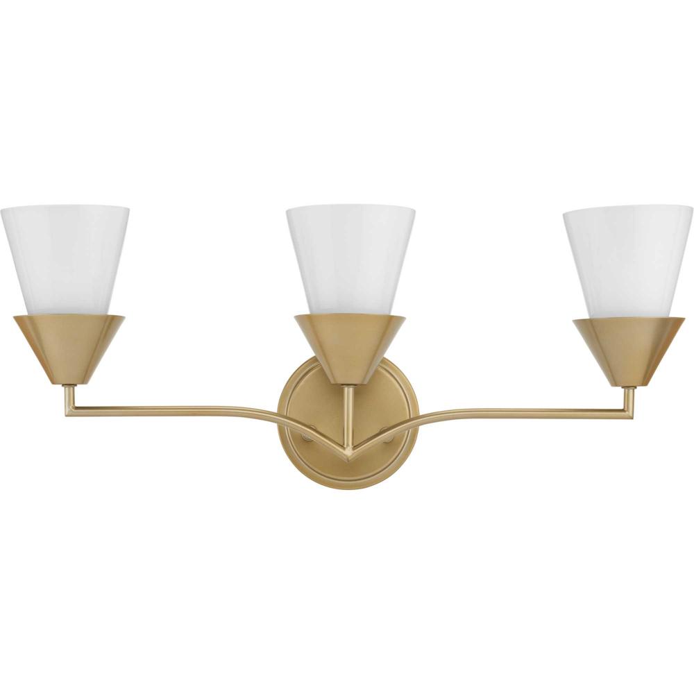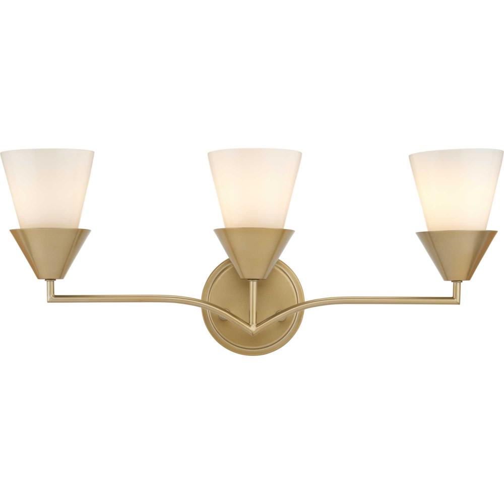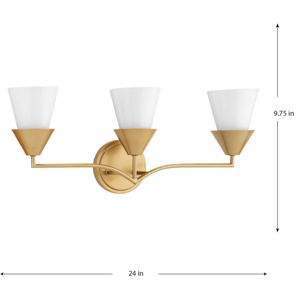The Pinellas Vanity Light gets to the point with a modern expression of a timeless form. The signature dual conical motif coated in a beautiful Soft Gold finish has the elements artfully nested together to provide a pleasing diffusion of light. This fixture is part of the Progress Lighting Design Series, a lighting collection offering fashionable styles and luxury lighting for the home.