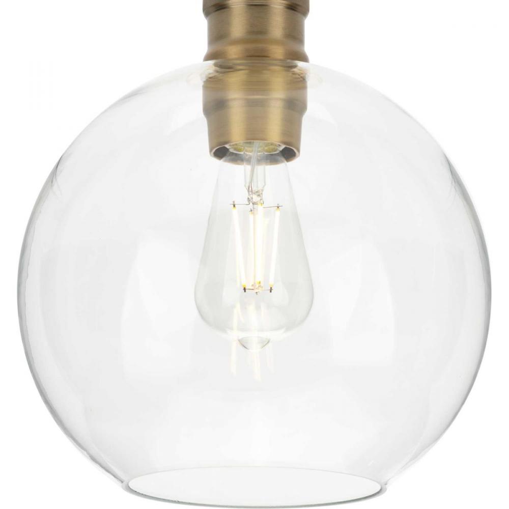Incorporate a clean design with generous scale with a flush mount from the Hansford Collection. A clear globe-style glass shade with an open-rimmed bottom is held in place by a knurled metal light base. The light fixture's circular ceiling plate is coated in a golden vintage brass finish.