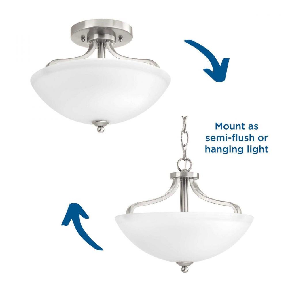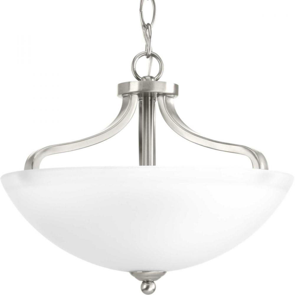 Semi-flush fixture convertible to hanging pendant with included hardware and instructions;Provides a contemporary complement to casual interiors popular in today's homes;Features Brushed Nickel finish;Etched glass shade adds distinction and provide ple