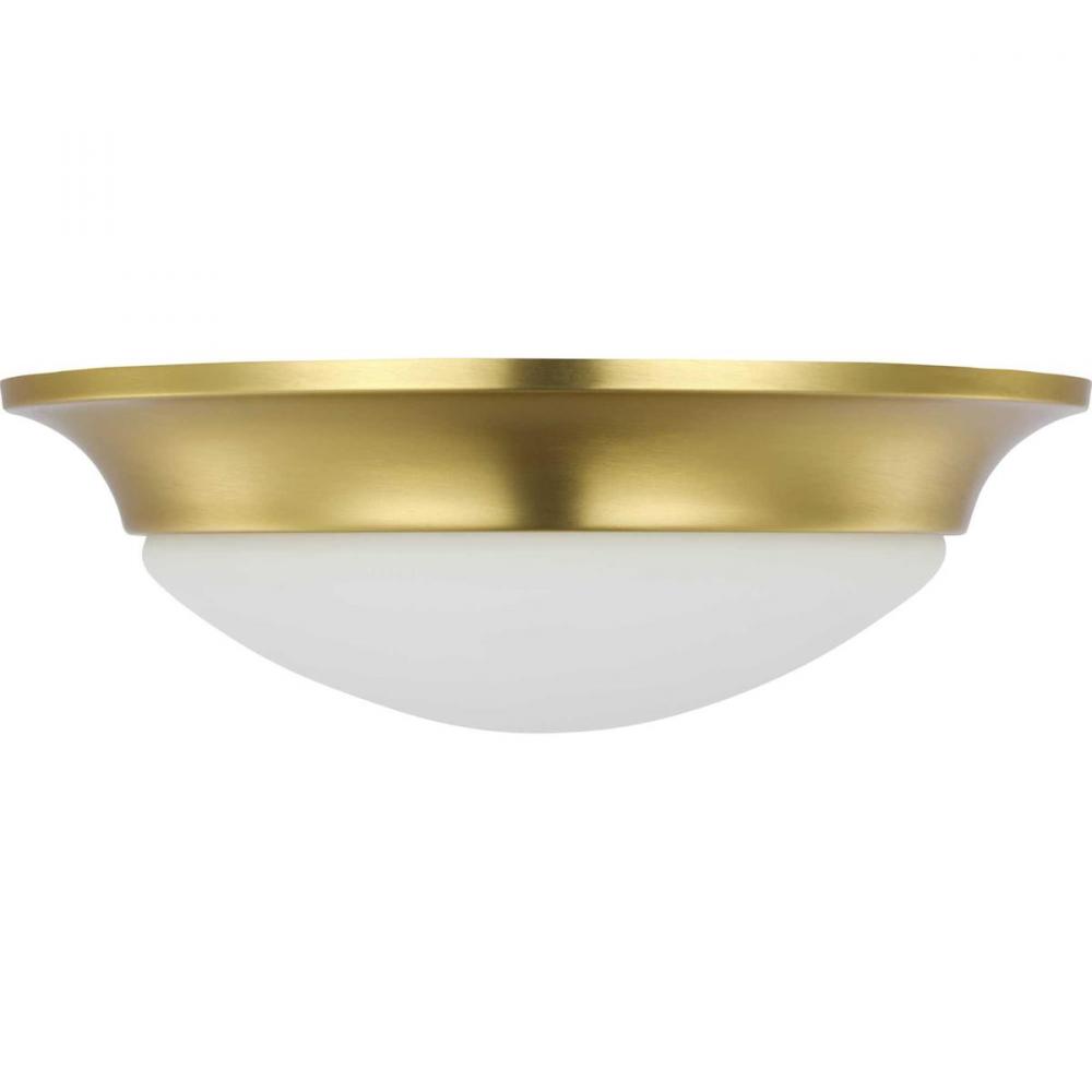 This flush mount proves that embracing comfort doesn't mean settling for boring or plain style. A delicate, etched white glass shade is ready to grant a generous glow. The shade is encircled by an enchanting, satin brass beveled frame for an understated, elegant design.