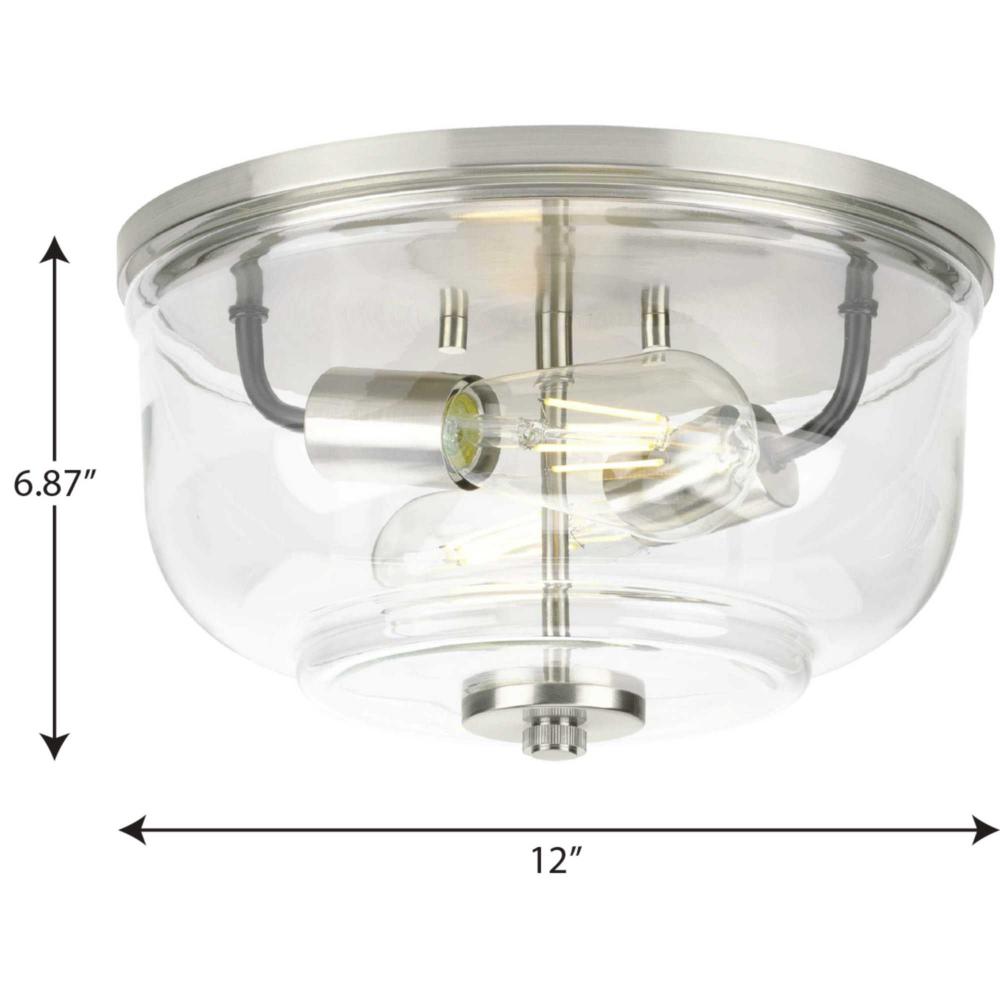 Integrated historical industrial elegance into your home decor with the Rushton Collection 2-Light Brushed Nickel Clear Glass Industrial Flush Mount Ceiling Light. The circular ceiling plate, smooth light bases, and decorative detail at the bottom of the shade are coated in a beautiful brushed nickel finish. Light sources glow from within the clear glass shade for elegant illumination.
