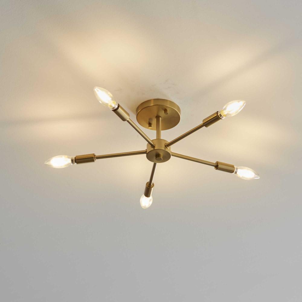 Delayne has a mid-century appeal defined by an array of arms that extend outward from a rounded, central support. Its beautiful metallic finish interacts with the light, casting reflections on bedrooms, bathrooms and living room ceilings. Select decorative light bulbs in a clear or white finish to further enhance this dynamic style.
