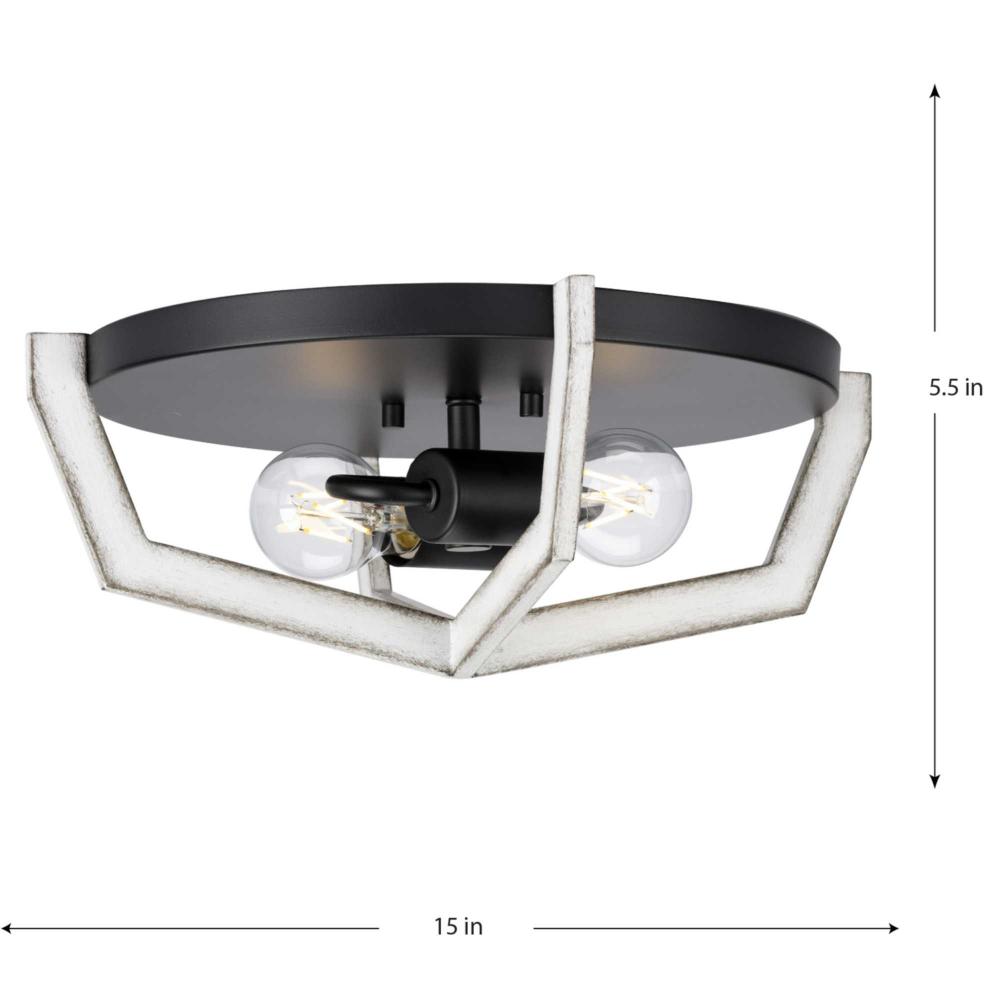 Clean, modern lines combine with rustic elements in the Galloway Collection Flush Mount Light. A lightly distressed white finish highlights an open, angular frame suspended from an impressive circular canopy finished in crisp matte black. Matte black columns hold lights that glow brightly within the stately form to illuminate spaces in a casually elegant style. The close-to-ceiling design provides clear, bright illumination to bedrooms, hallways and foyers. Use vintage-style decorative bulbs (sold separately) to enhance the rustic effect.