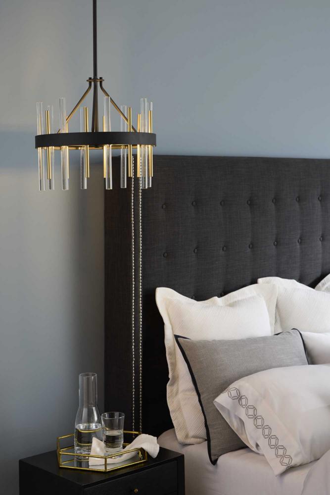 Ideal for halls & foyers, breakfast nooks and bedrooms, this chandelier presents an artful arrangement of clear glass and golden metal rods accented by black