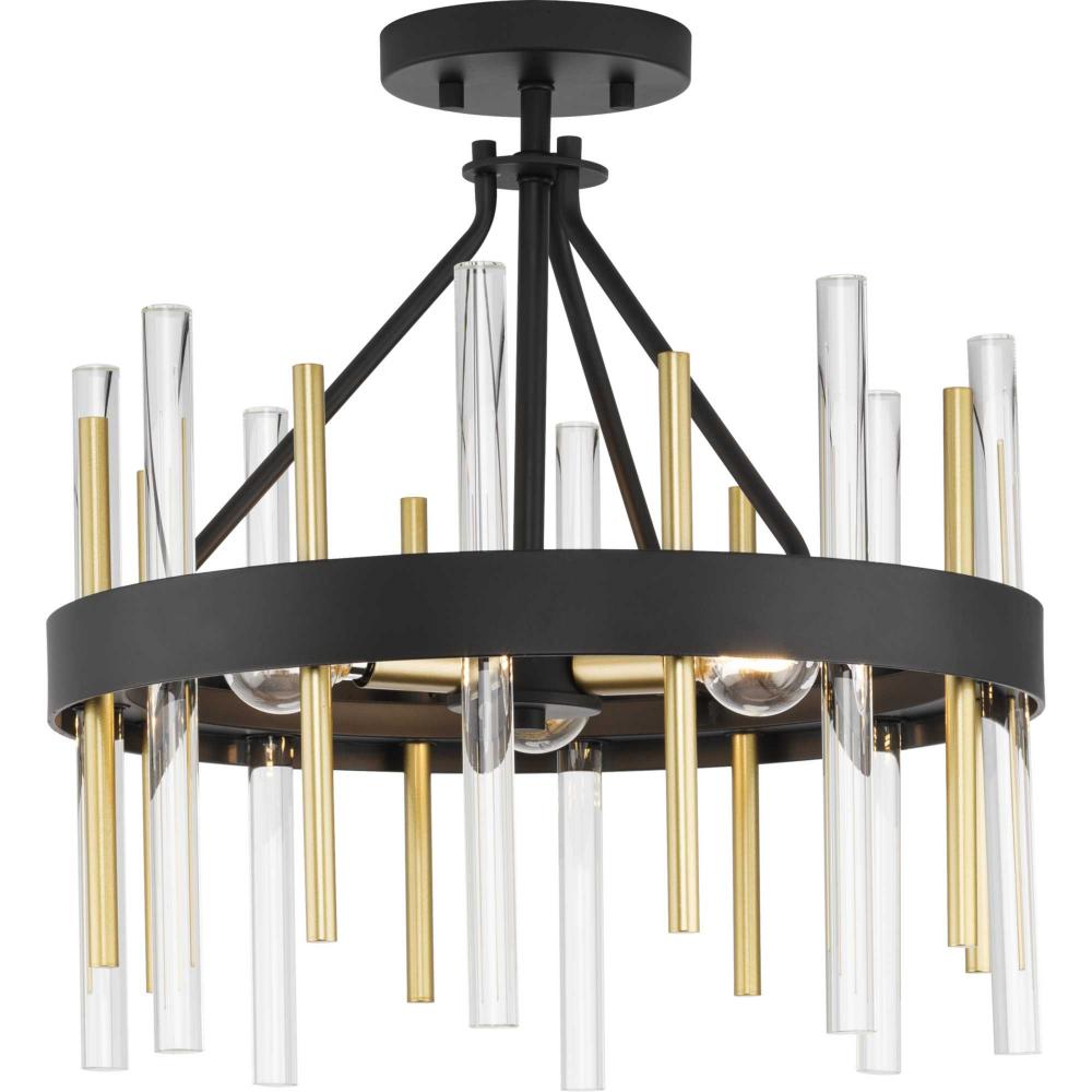 Suitable for sleek and sophisticated luxe industrial and contemporary interiors, the Orrizo Semi- Flush Convertible presents an artful arrangement of clear glass and golden metal rods that adorn a black band. Orrizo provides a soft ambient light to breakfast nooks, bedrooms, halls and foyers. This fixture is part of the Progress Lighting Design Series, a lighting collection offering fashionable styles and affordable luxury lighting for the home.