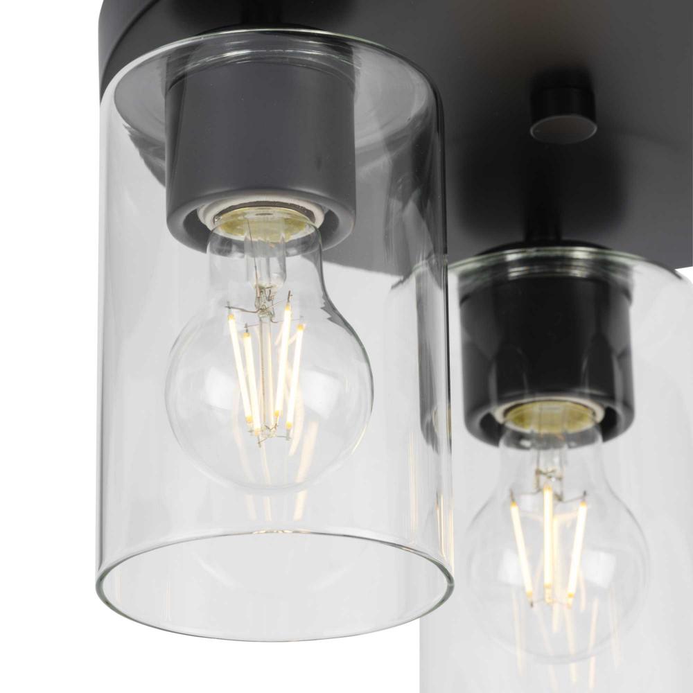 The light's slender design complements mid-century modern, transitional and contemporary settings with a simple round canopy suspended over cylindrical glass shades
