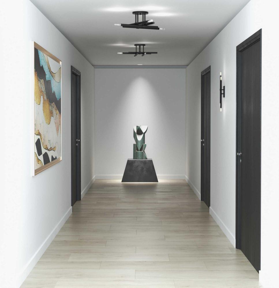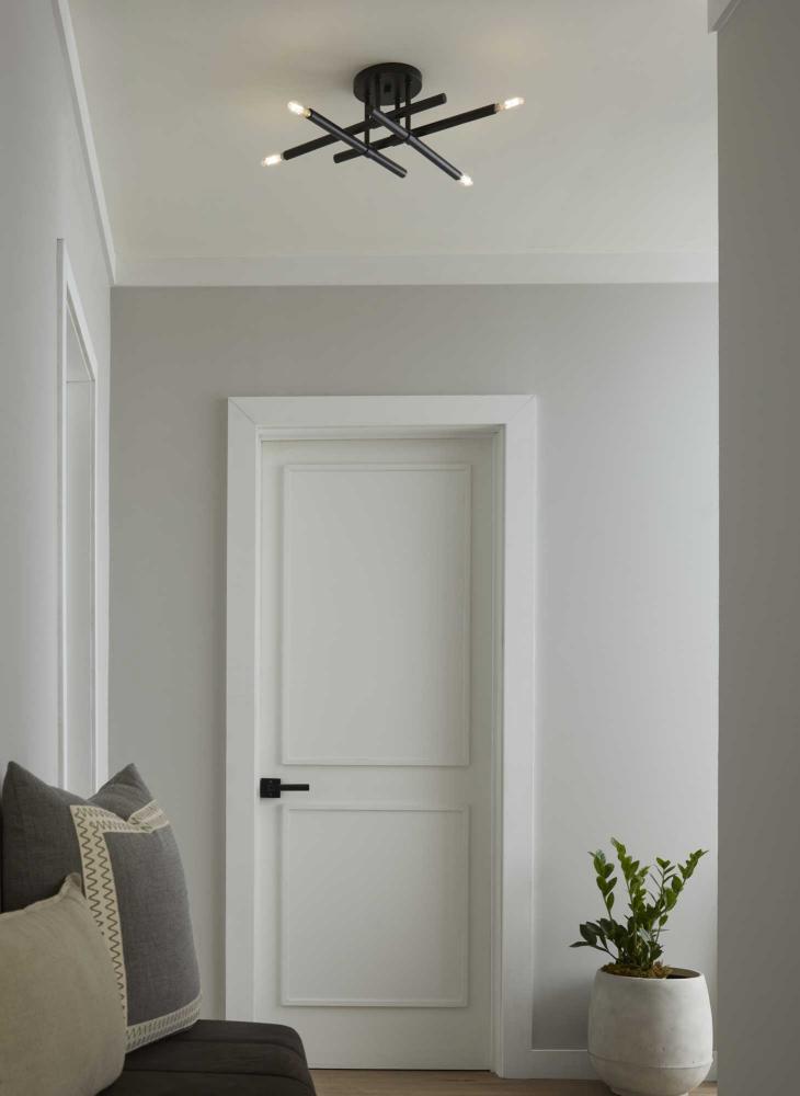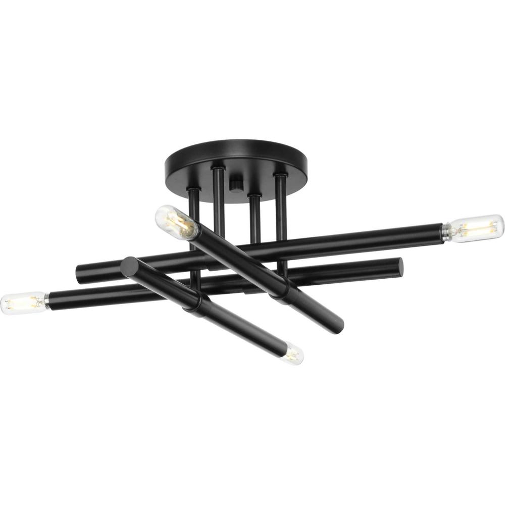 The Arya Collection has a lively essence created by the rhythm of slender, graceful features. The style offers modern appeal with understated elegance.Staggered arms coated in matte black are suspended from a central axis, defining this bold architectural form. The semi-flush mount light brings a modern flair to ceilings in bedrooms, halls and home theaters and living rooms in luxe, mid-century modern and contemporary settings. This fixture is part of the Progress Lighting Design Series, a lighting collection offering fashionable styles and affordable luxury lighting for the home.