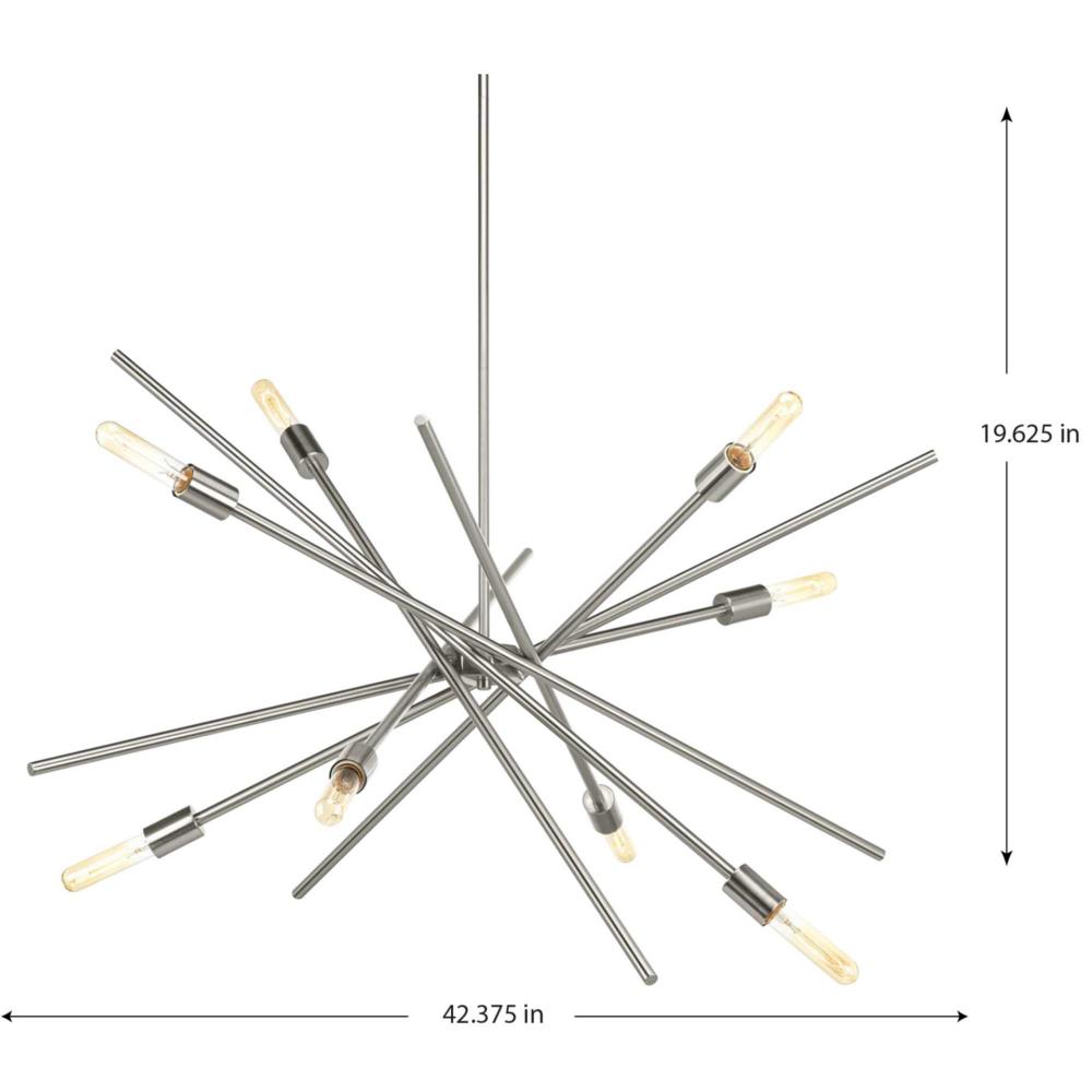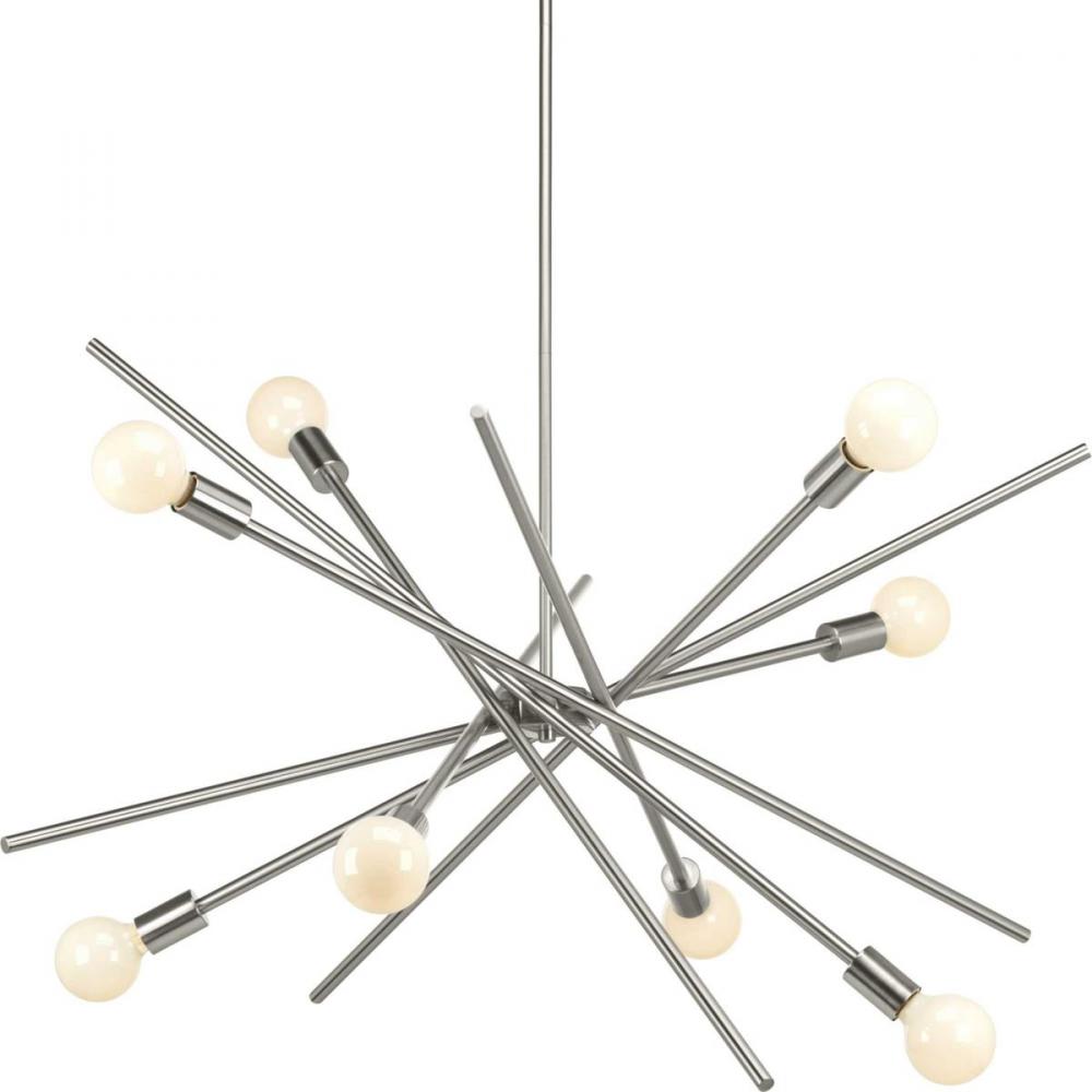 An iconic style design that adds dynamic flair to any room;Versatile space-aged inspired pieces that can be incorporated into a variety of interiors;Brushed Nickel finish;Chandelier uses eight 60W max. medium base bulbs (sold separately);Perfect showcase f