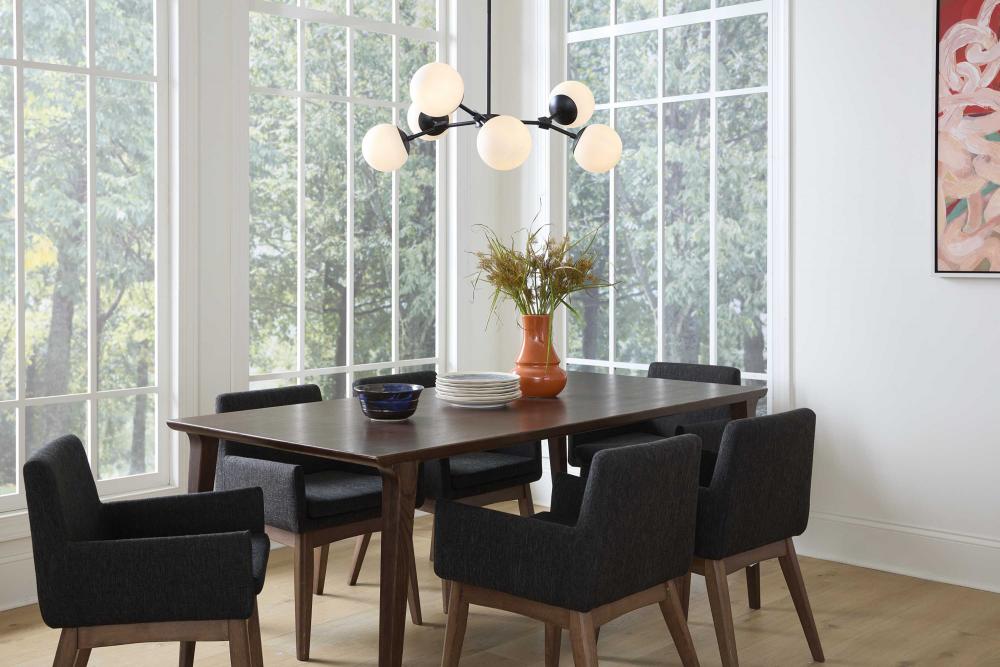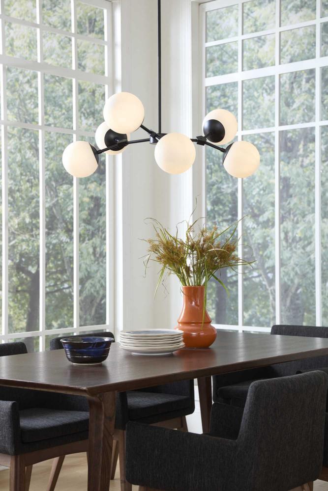 The chandelier's fashionable design offers a chic statement to mid-century modern, contemporary, mountain modern and modern interiors