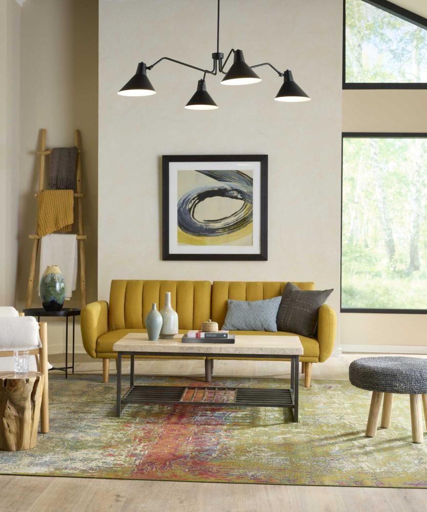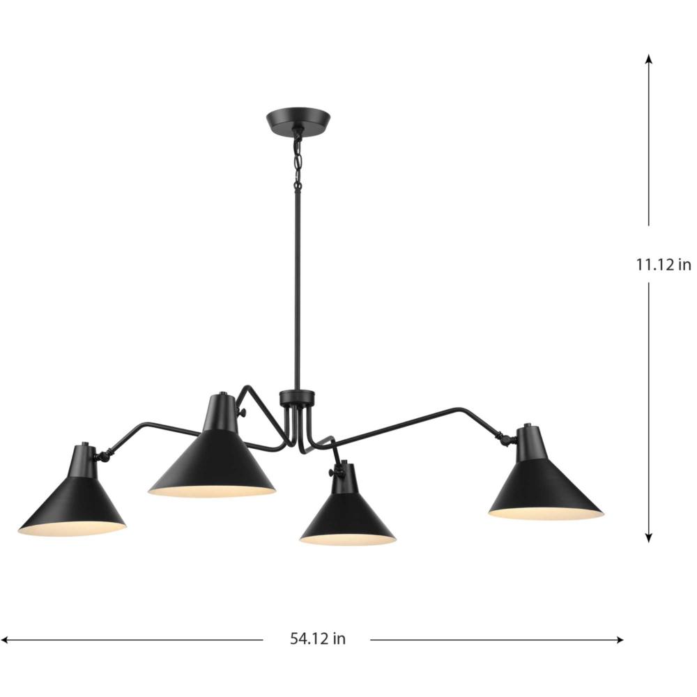 Angular metal shades suspended from an expansive frame create a signature design statement in the Trimble Collection. Its mid-century modern inspiration incorporates a streamlined approach and rich visual details that bring iconic style to open spaces. Its opaque metal shades are finished in subtle matte black. This pendant is ideal for delivering crisp downlight to living rooms, dining rooms and bedrooms in mid-century modern and luxe industrial settings.