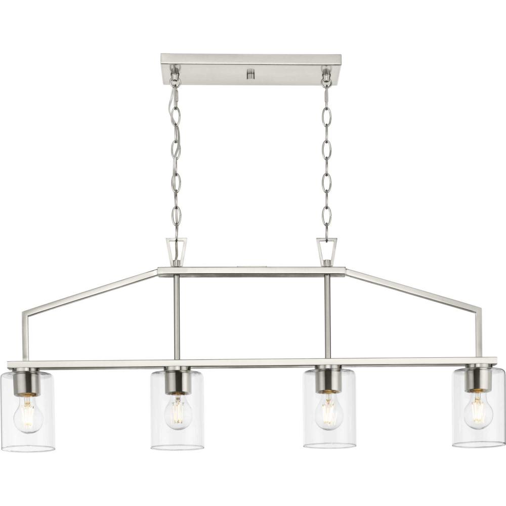 The Goodwin Island Light features a clean design that seamlessly blends with today's modern decor. Angular, crisp lines highlight the frame’s modern profile. Columns of clear glass shade offer bright illumination for dining rooms, kitchens and bars in modern farmhouse settings.