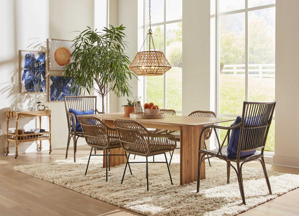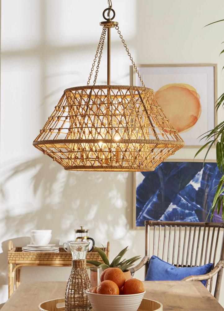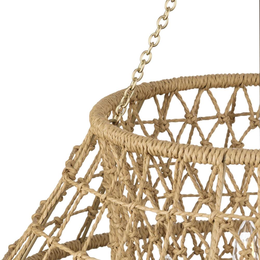 The fixture's frame is finished in a hand-knotted jute strands, creating an artisanal look