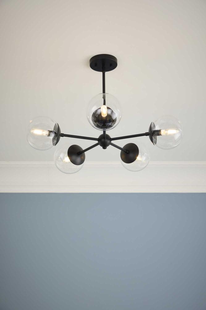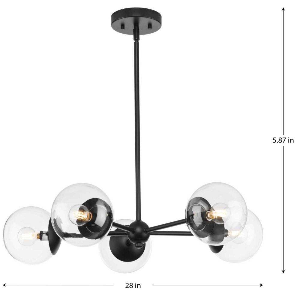 Long lines ending in clear glass globe shades define the modern aesthetic of the Atwell Chandelier. One central stem is capped by clear glass, creating bright illumination from the light source glowing within. Atwell fits beautifully into mid-century modern and contemporary settings, delivering ambient illumination to foyers, dining rooms and living rooms.
