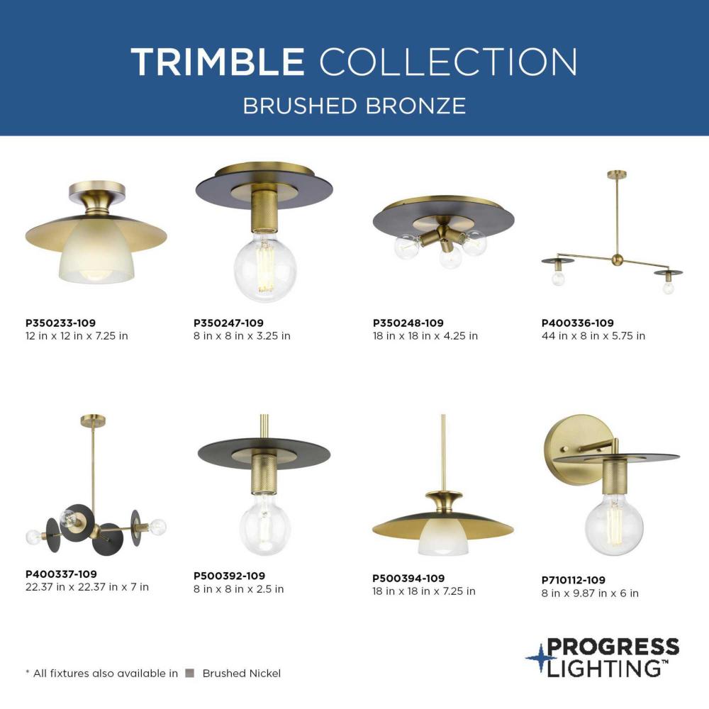 An intriguing flat disc shade forms the basis of the Trimble Collection, whose mid-century modern inspiration is perfect for open spaces in mid-century modern and luxe industrial settings. A two-toned finish on the shade features smooth brushed bronze and classic matte black plus a knurled metal lamp socket is coated in brushed bronze providing additional rich visual interest. Use vintage-style bulbs to add modern appeal and to cast crisp illumination to kitchens, bars and dining rooms.