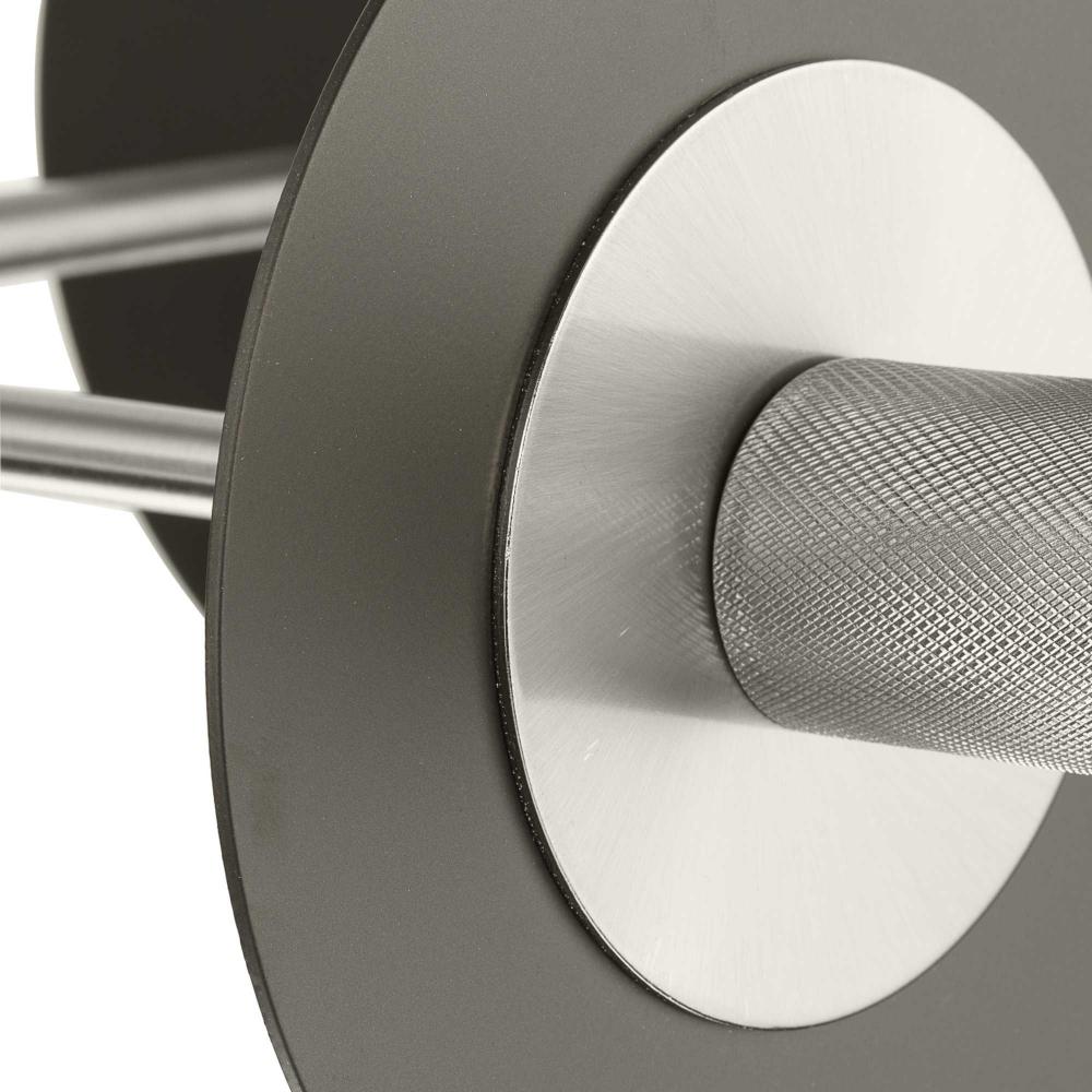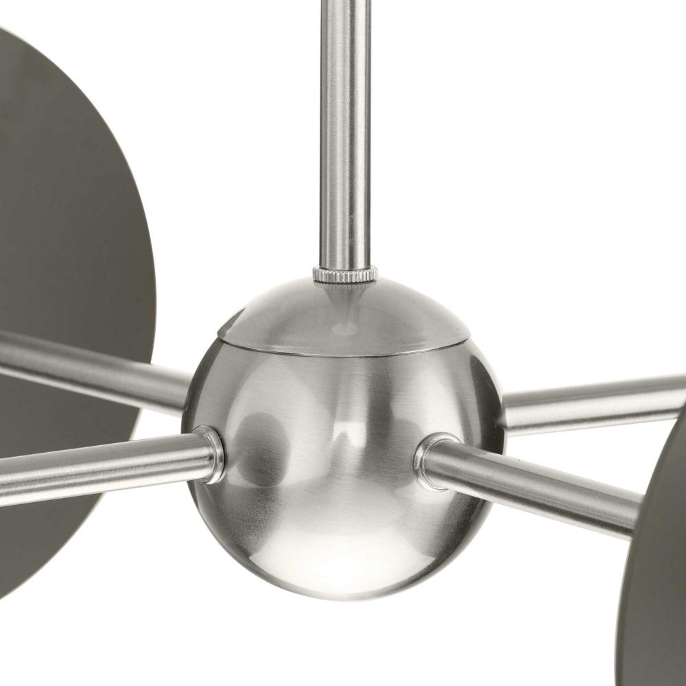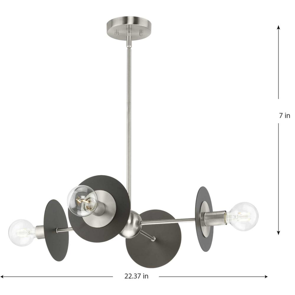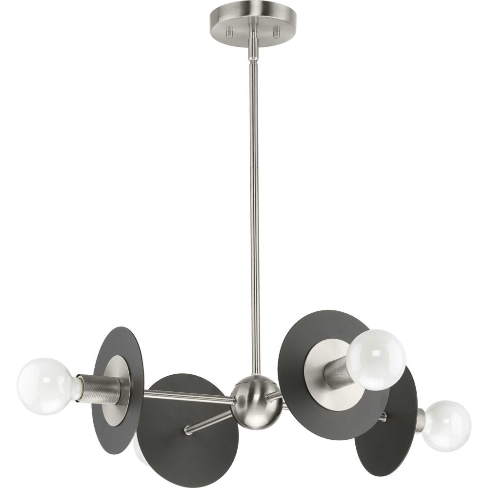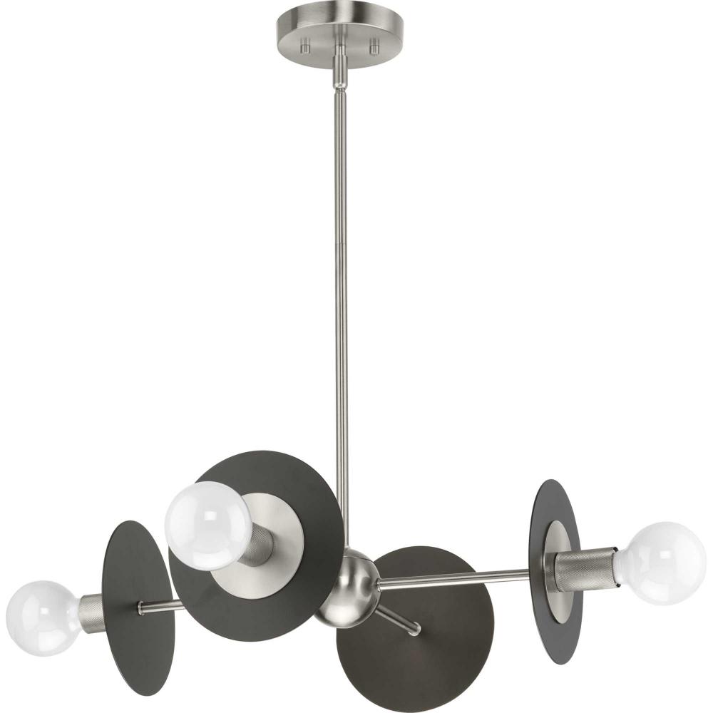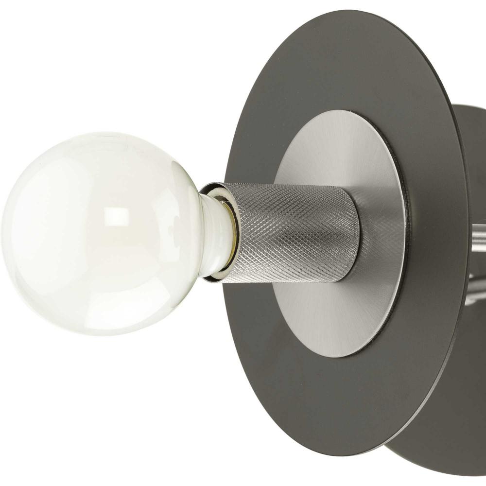The fixture's dual-toned finish features a pairing of brushed nickel arms and painted graphite discs
