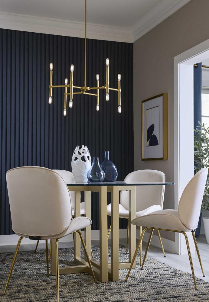 The Arya Collection has a lively essence created by the rhythm of slender, graceful features. The style offers modern appeal with understated elegance.Staggered arms coated in a soft brushed gold are suspended from a central axis, defining this bold architectural form. The impressive chandelier brings a modern flair to ceilings in dining rooms, bedrooms and living rooms in luxe, mid-century modern and contemporary settings. This fixture is part of the Progress Lighting Design Series, a lighting collection offering fashionable styles and affordable luxury lighting for the home.