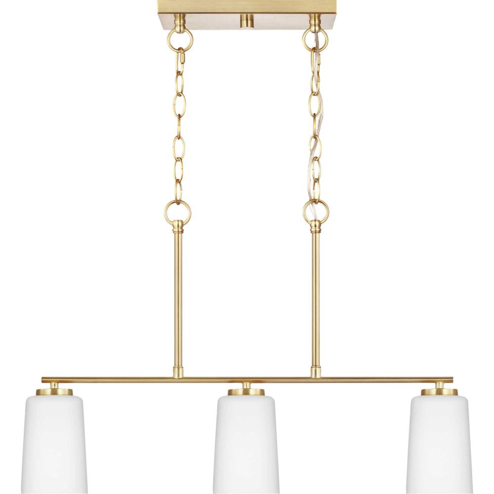 Fundamentally modern but with a traditional twist, the Adley linear chandelier combines etched white glass shades with simple, straight bars finished in satin brass. This light is an elegant choice for illuminating kitchen, bars and dining rooms in transitional settings and contemporary settings. The fixture has 48 in. of chain to customize it for a variety of ceiling heights and can be used on a sloped ceiling.