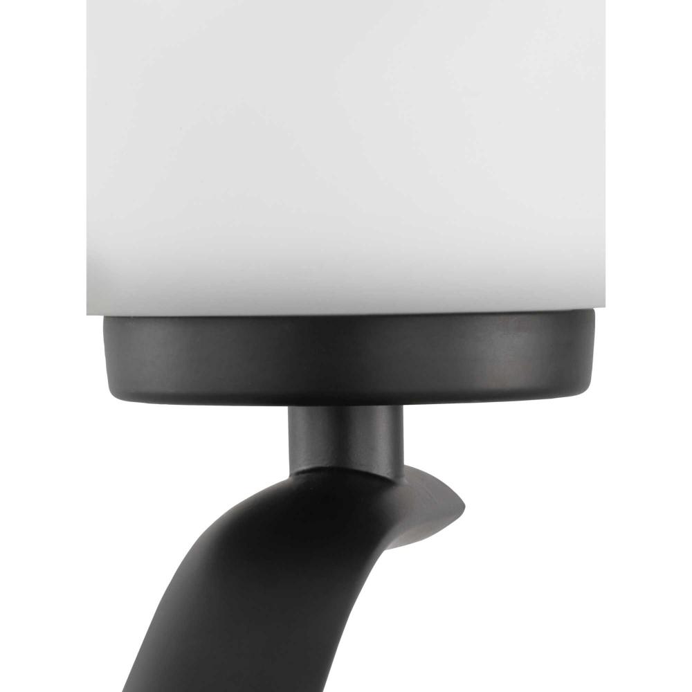 The clean design combines etched white glass shades with a curved arms and simple, straight bars