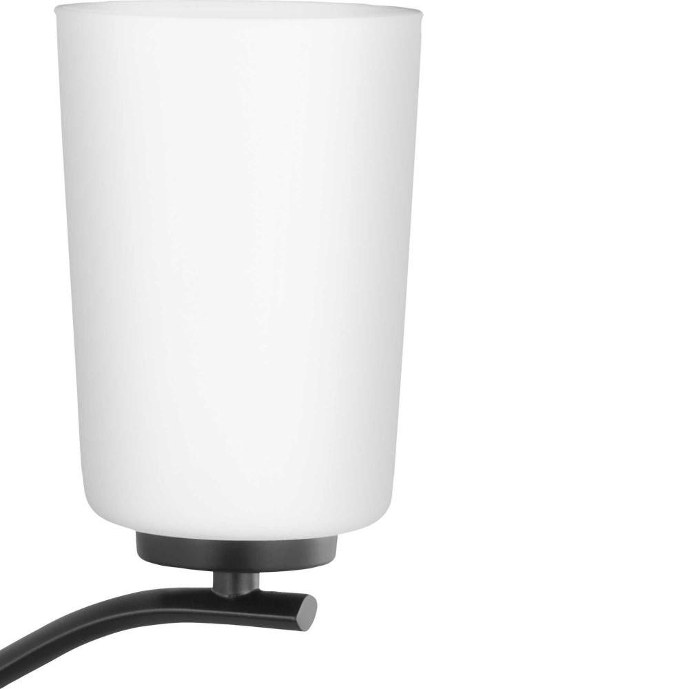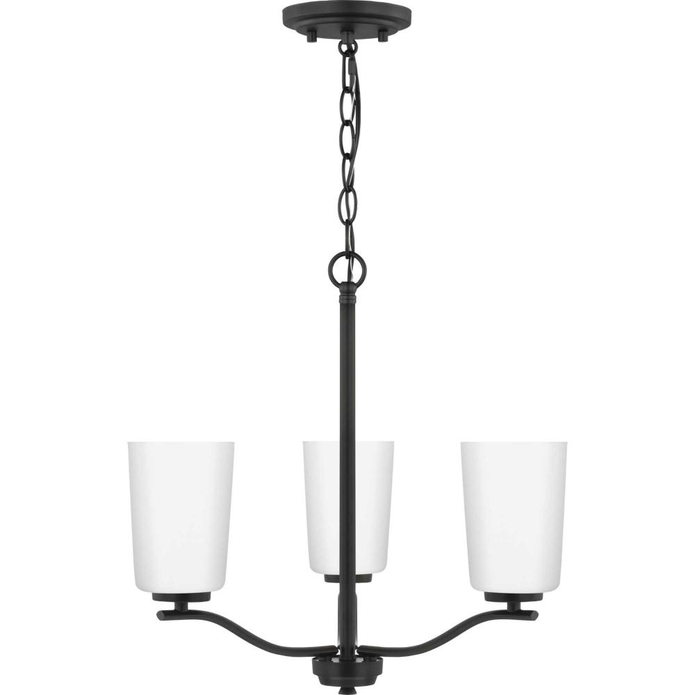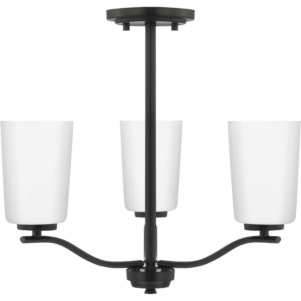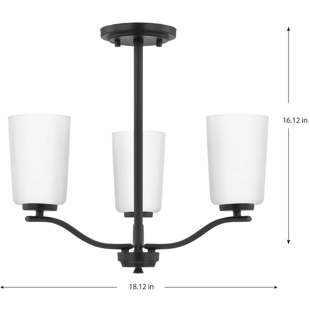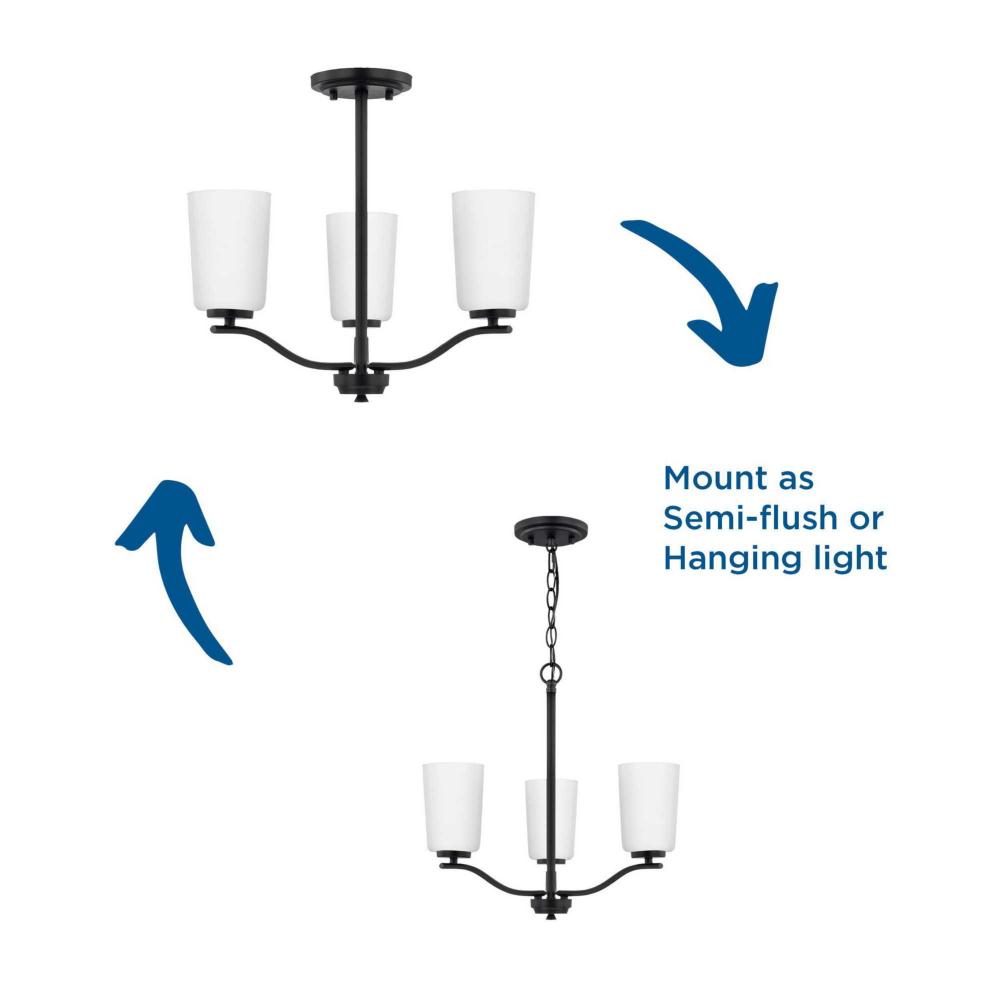 Fundamentally modern but with a traditional twist, the Adley semi-flush convertible chandelier combines etched white glass shades with a curved arms and simple, straight bars finished in matte black. This light is an elegant choice for illuminating kitchens and breakfast nooks in transitional settings and contemporary settings. The fixture has 48 in. of chain to customize it for a variety of ceiling heights and can be used on a sloped ceiling.