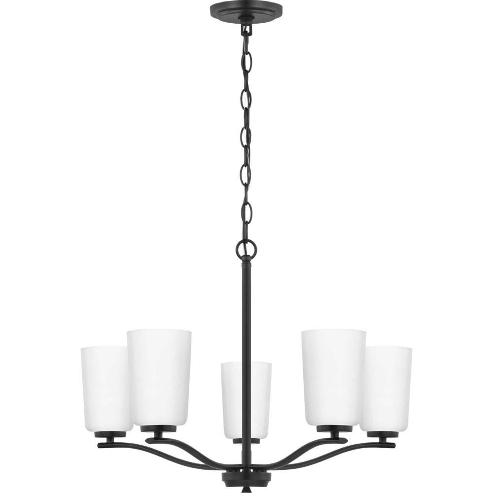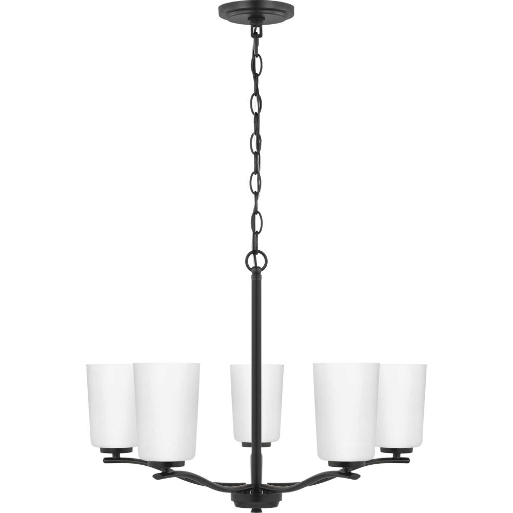 Fundamentally modern but with a traditional twist, the Adley chandelier combines etched white glass shades with a curved arms and simple, straight bars finished in matte black. This light is an elegant choice for illuminating dining rooms, halls and home theaters or bedrooms in transitional settings and contemporary settings. The fixture has 48 in. of chain to customize it for a variety of ceiling heights and can be used on a sloped ceiling.