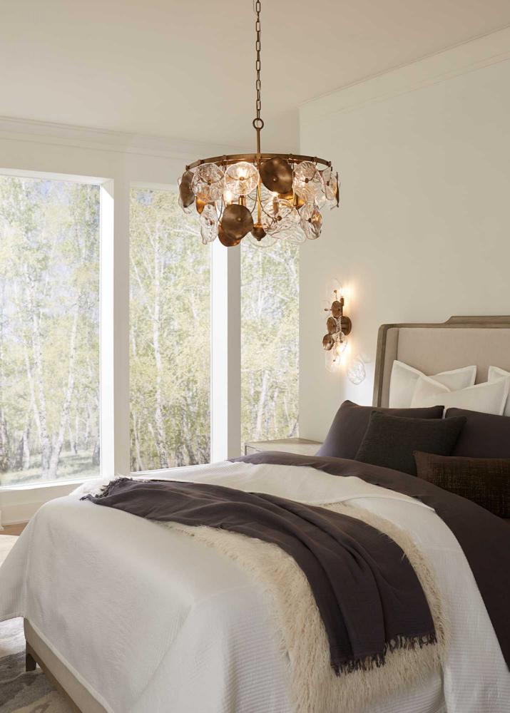 The Loretta Collection captures the serene feel of lily pads floating in a gently rippling pond. Glimmering artisanal clear glass is paired with handcrafted metal leaves finished in a soft, Gold Ombre patina.Light sources deliver an ambient glow behind the luxe glass and metallic discs that festoon its graceful frame. This fixture is part of the Progress Lighting Design Series, a lighting collection offering fashionable styles and affordable luxury lighting for the home.