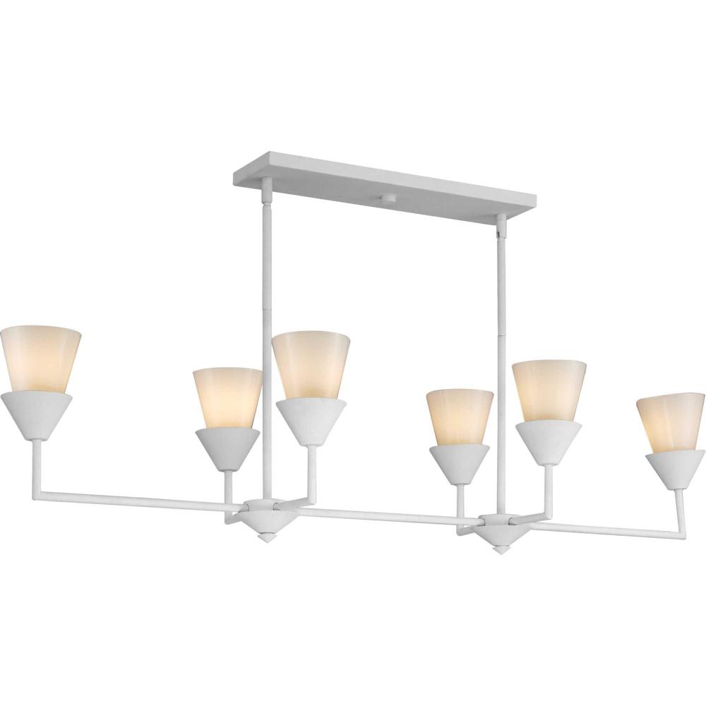 The Pinellas Linear Chandelier gets to the point with a modern expression of a timeless form. The signature dual conical motif has the elements artfully nested together to provide a pleasing diffusion of light from its opal glass shades. This fixture is part of the Progress Lighting Design Series, a lighting collection offering fashionable styles and affordable luxury lighting for the home.
