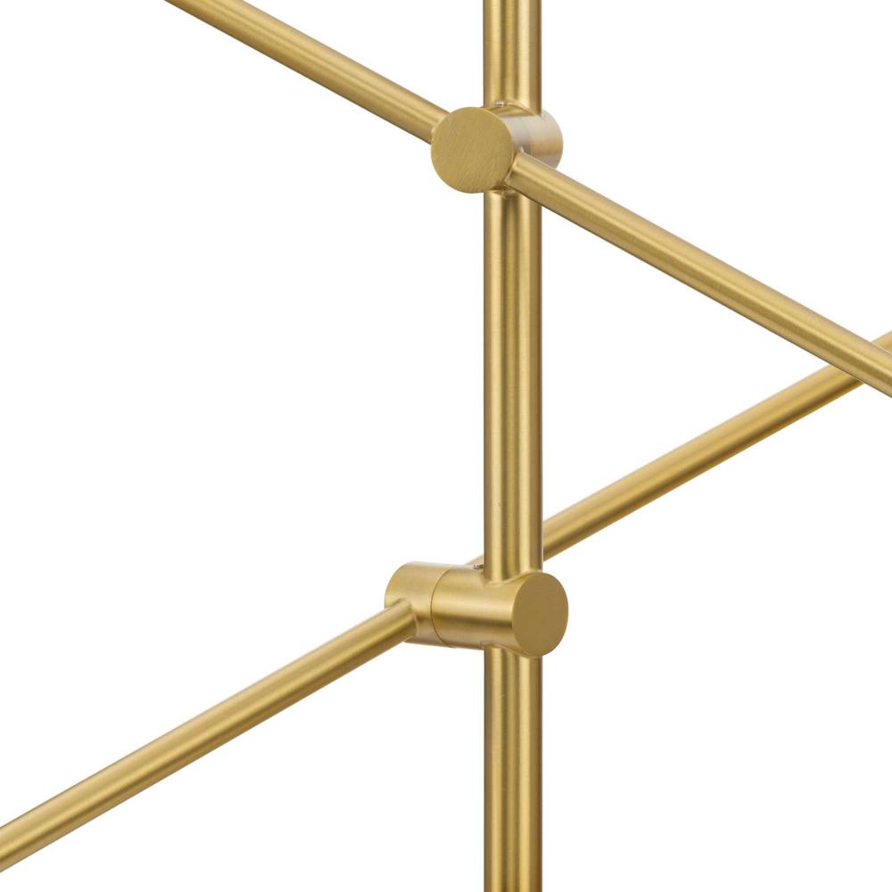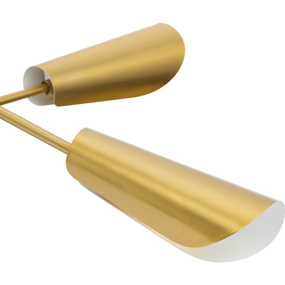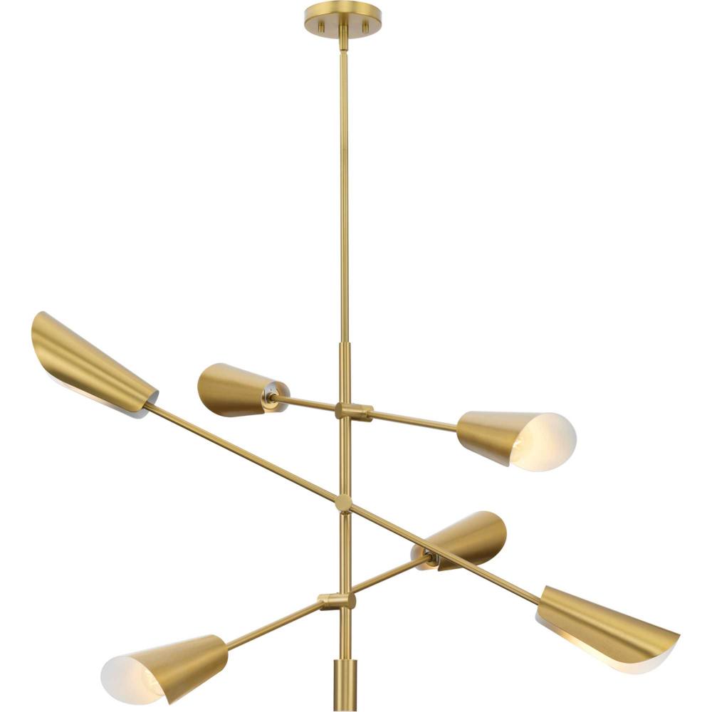 Cornett trumpets its arrival on the scene with a blending of timeless modern design. The Six-Light Chandelier features dynamic angles finished in Brushed Gold, offering a dramatic counterpoint to the softly sculpted curves of the matching metal reflector shades.Light is directed out and downwards from its unique, curved construction.