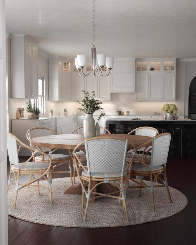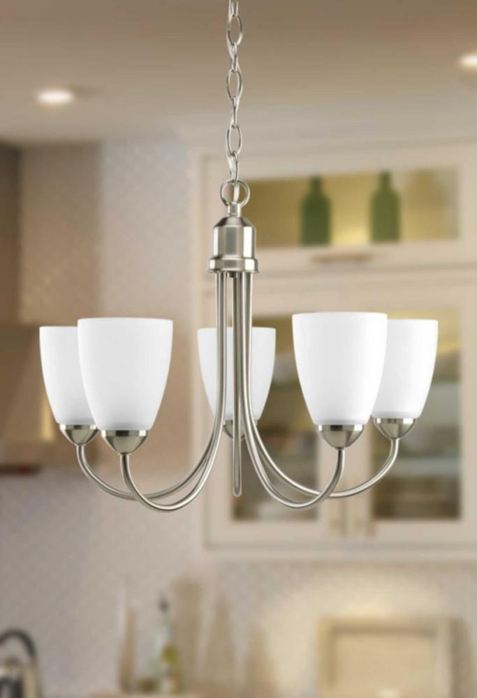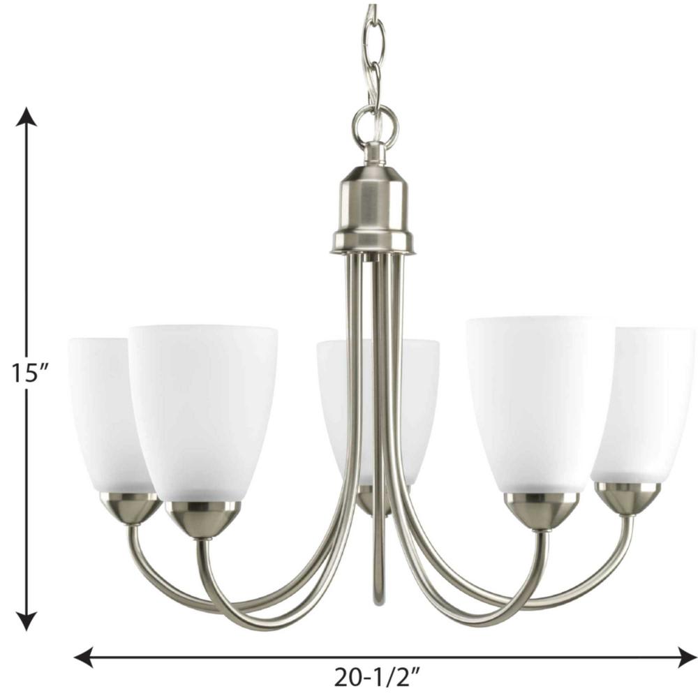 Five-light chandelier from Gather possesses a smart simplicity to complement today's home. Brushed Nickel metal arms descend downwards and curve sharply to prop white etched glass shades. Etched glass add distinction and provide pleasing illumination to your room. Coordinating fixtures from this collection let you decorate an entire home with confidence and style. 42" of 9 gauge chain is supplied for ceiling chain mount.