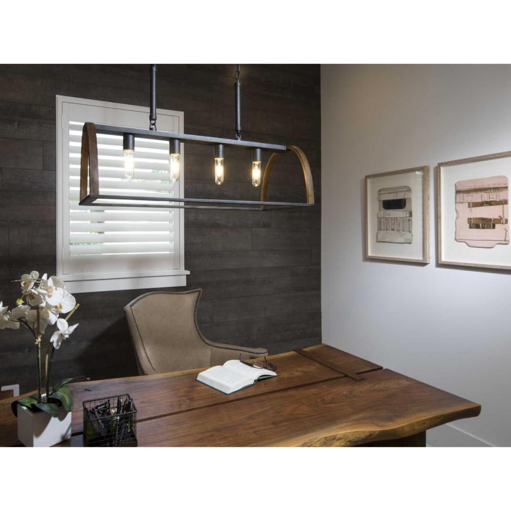 Fixtures within the Trestle collection offer a handsome look for industrial or rustic living spaces. Featuring a hand painted cage with geometric elements, pendant and linear options can revive a look over kitchen island or bar, as well as dining and living spaces. The Gilded Iron finish is enhanced by hand-painted oak accent. Four-light island light.