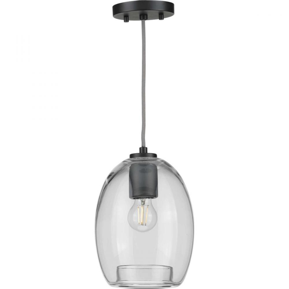 Infuse your home with the subtle industrial flair of this mini-pendant. Inspired by the outstanding architecture of suspension bridges, the light fixture features a fabric cord that attaches to a beautiful graphite light base and smooth round ceiling plate. A clear glass shade with a rolled rim at its bottom adds an extra touch of artisan inspiration.