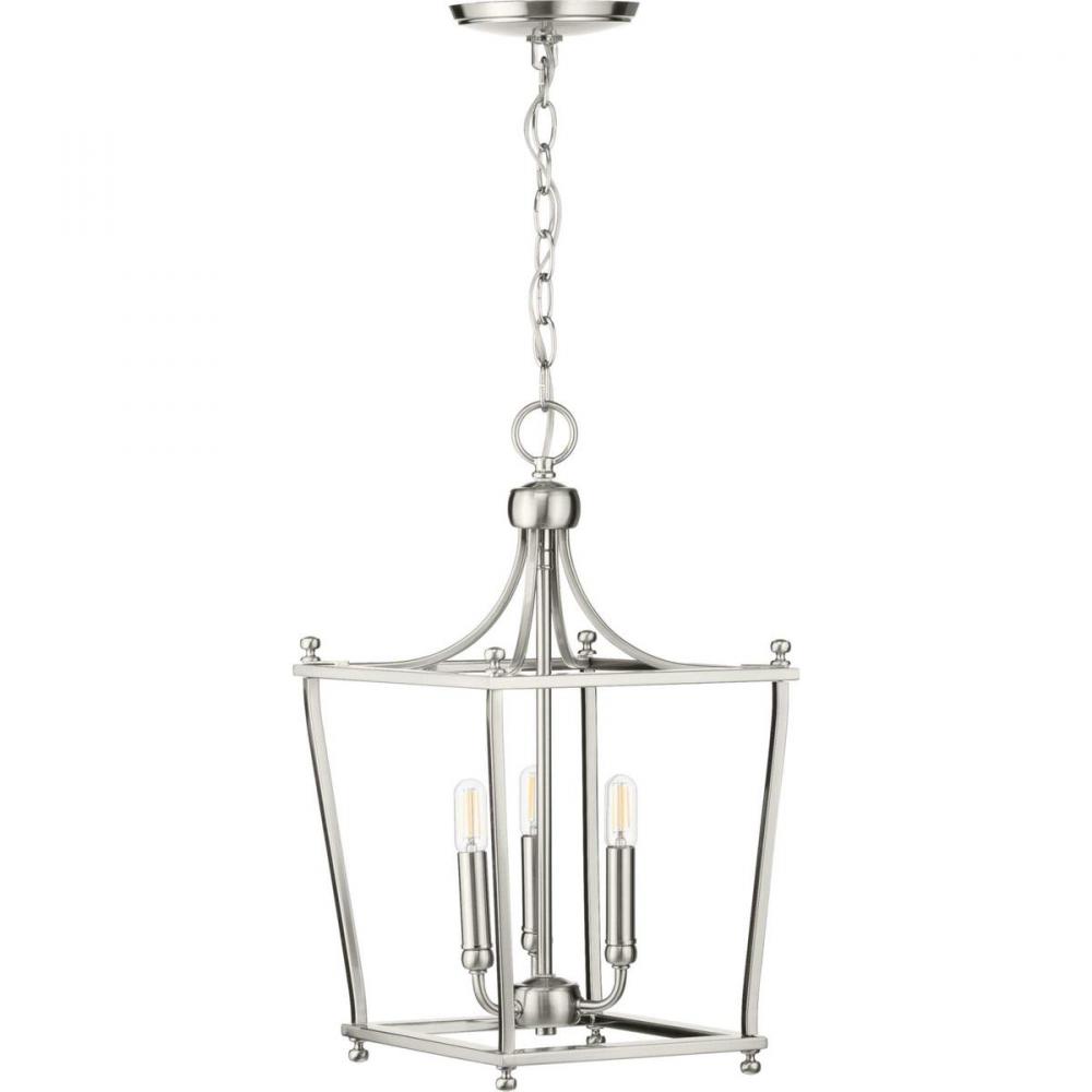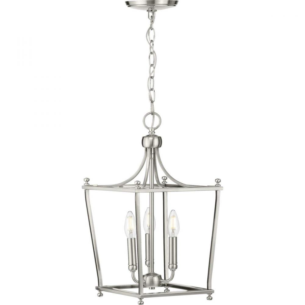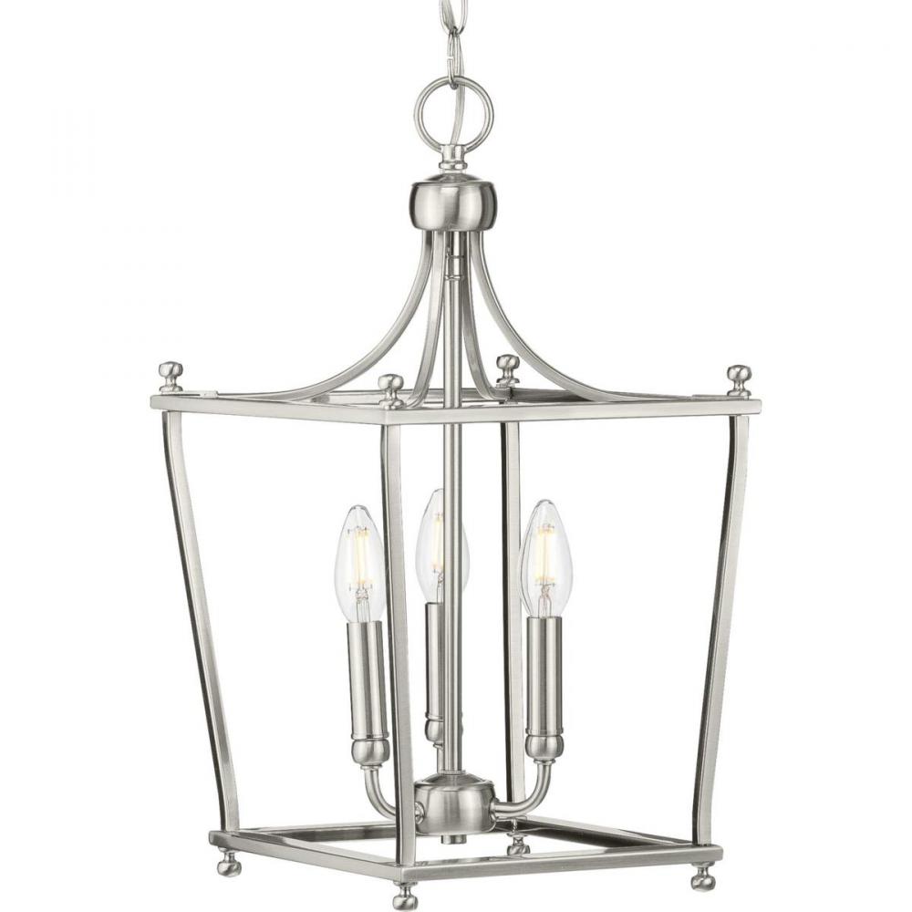 An open-cage metal frame creates a sophisticated, airy structure.;A beautiful brushed nickel finish coats the lantern-style frame for an eye-pleasing, handsome design.;Inside the frame perch smooth, simple light bases ready to offer your home a lovely glow
