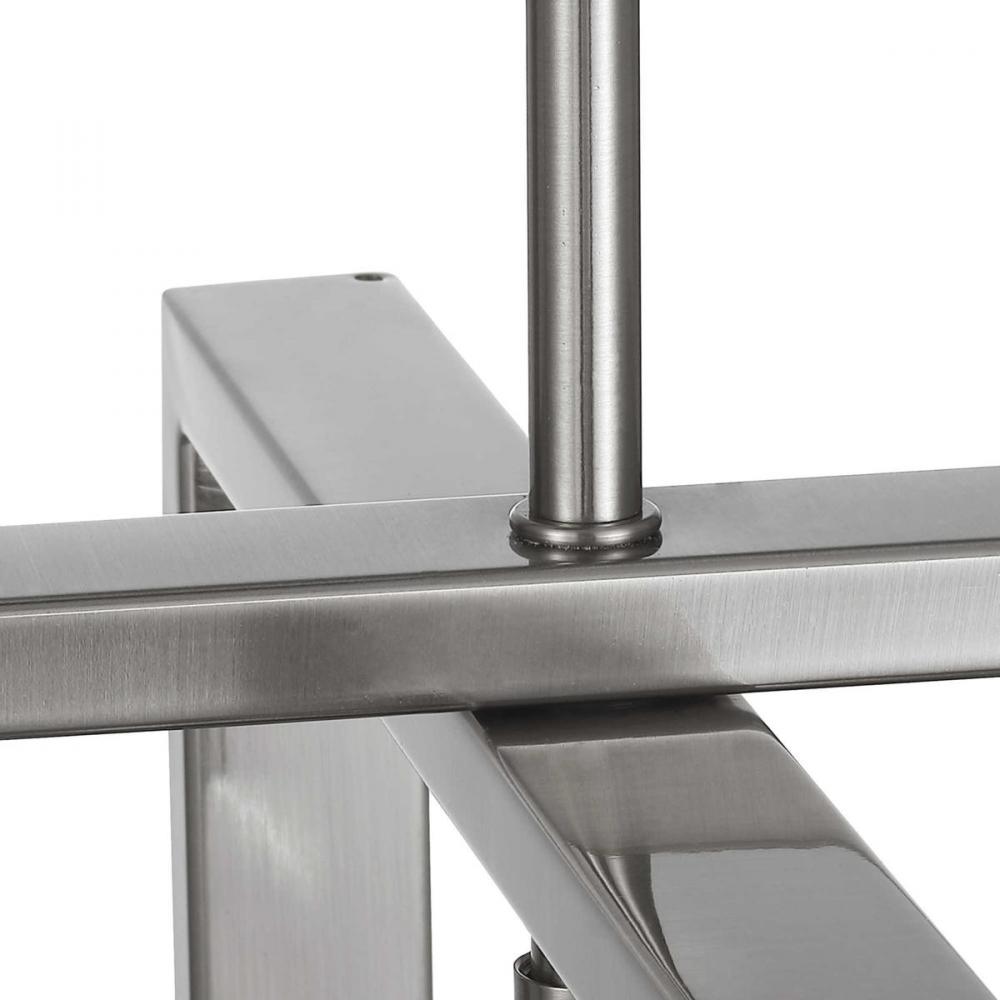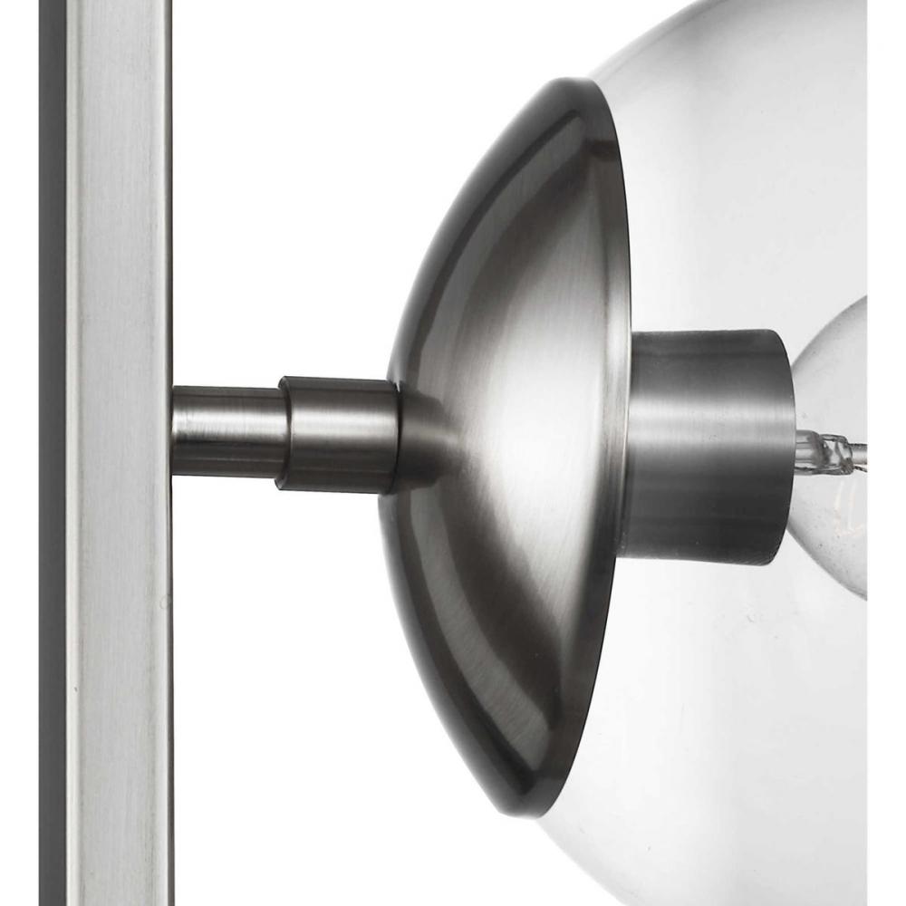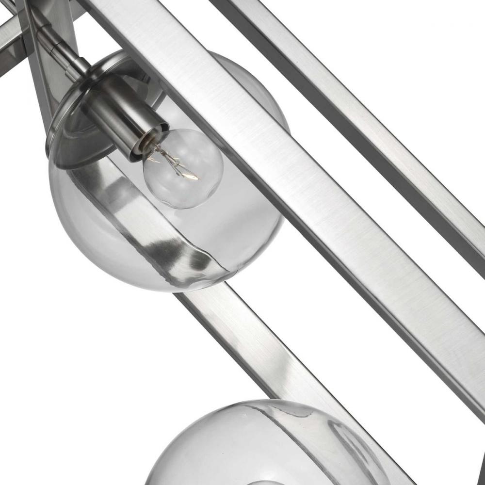 Clear, globe shades soften and contrast with the frame's sharp corners.;The light fixture features an intricate blend of circular and a one-of-a-kind architectural designs that is both remarkable and enduring.;Extraordinary on the first impression, but