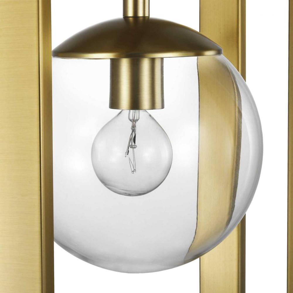Clear, globe shades soften and contrast with the frame's sharp corners.;The light fixture features an intricate blend of circular and a one-of-a-kind architectural designs that is both remarkable and enduring.;Extraordinary on the first impression, but