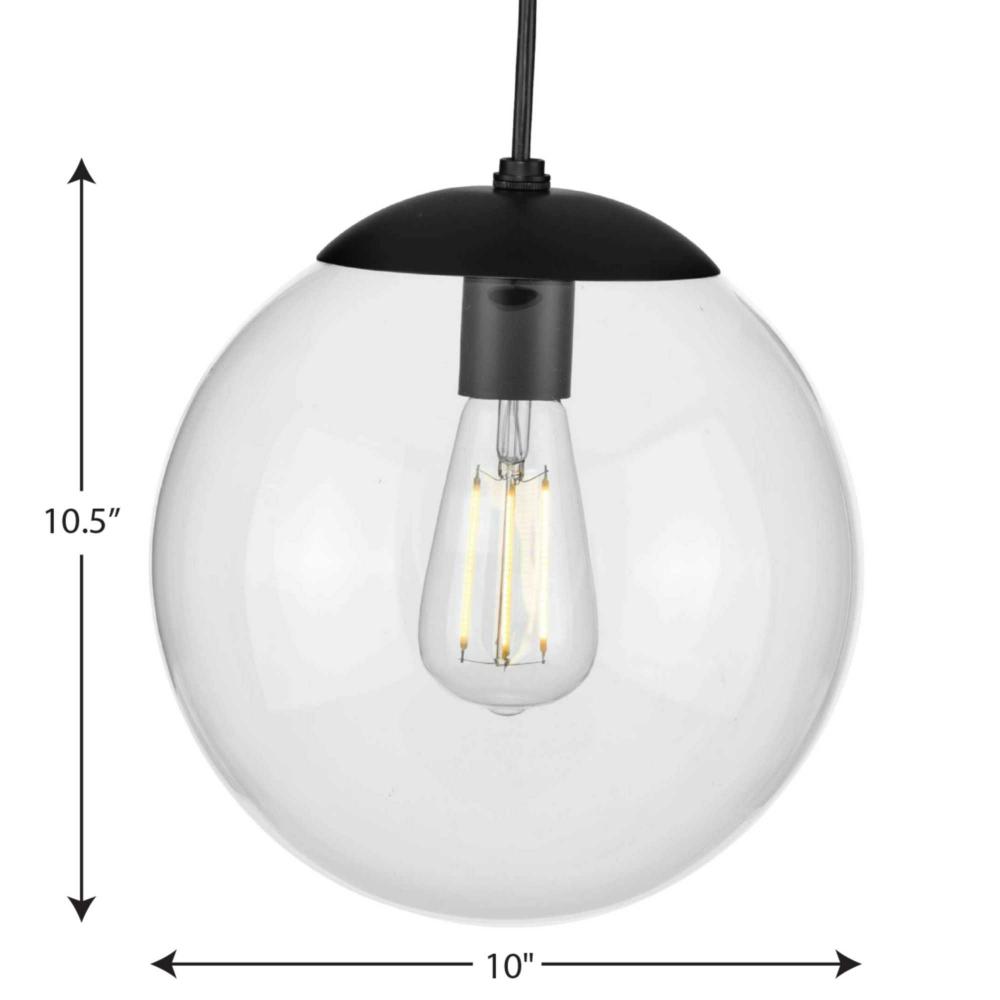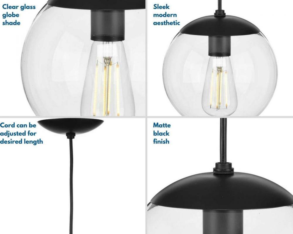 A light source glows from within a clear glass globe shade that fosters a soft and enduring design. The metal cap and light base are coated in a beautiful black finish that accentuates the hanging light's modern aesthetic. The light is suspended from a cloth cord that can be adjusted from height to meet your unique design needs.