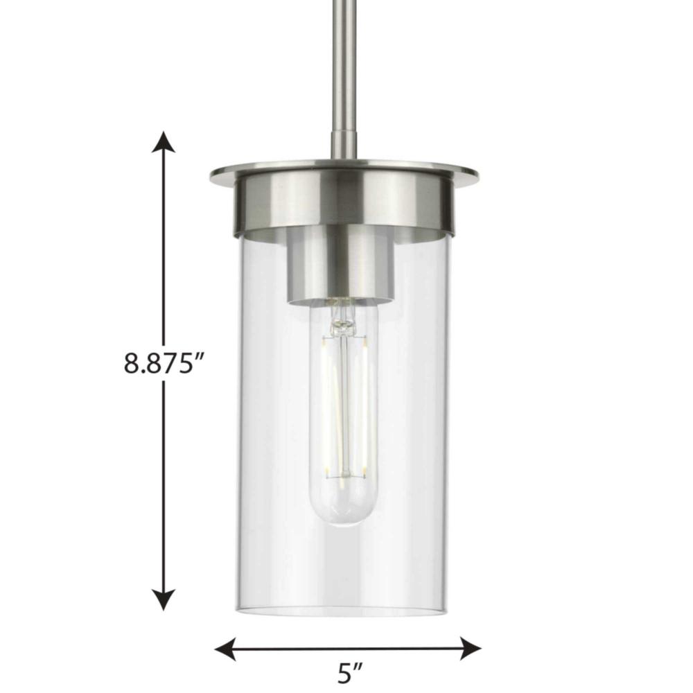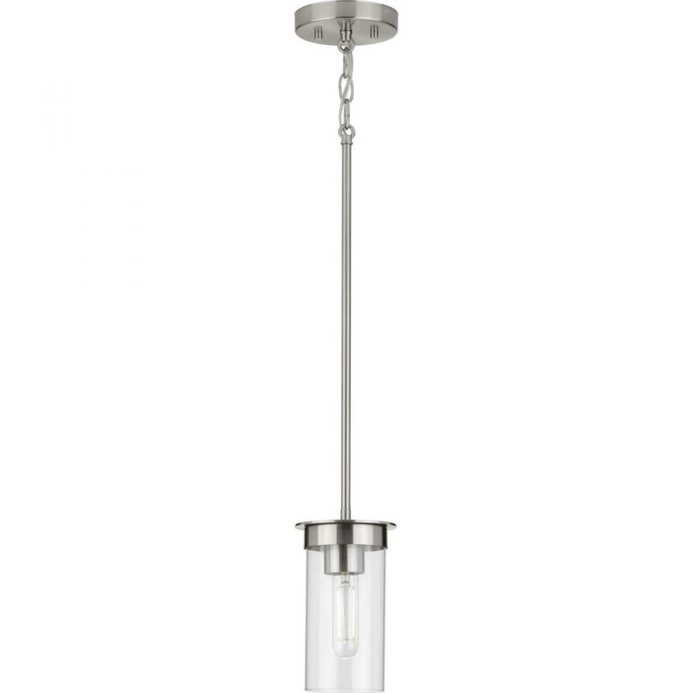 Balance the best of modern and traditional with the Kellwyn Collection 1-Light Brushed Nickel Clear Glass Transitional Mini-Pendant Hanging Light. The classic design is composed of crisp, clean lines coated in a beautiful brushed nickel finish for a touch of luxury. A light source glows within a clear, cylindrical glass shade for luxurious illumination.