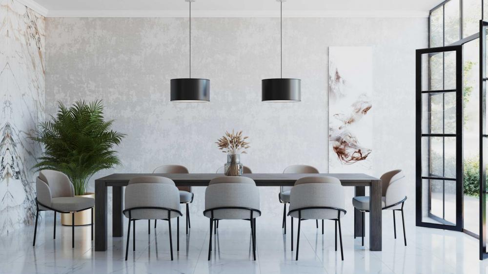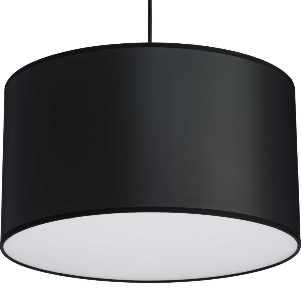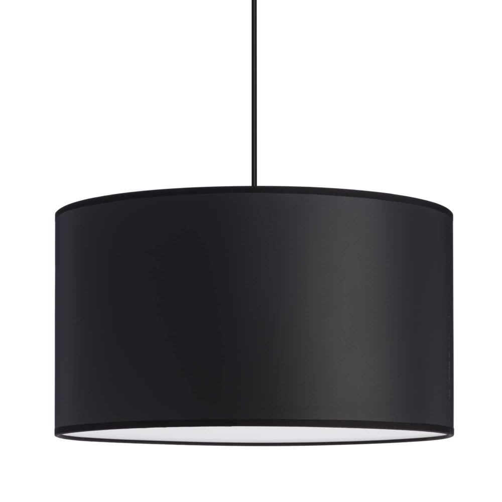 A drum fabric shade suspended from a single cord and capped by a diffuser delivers an inviting illumination to modern settings
