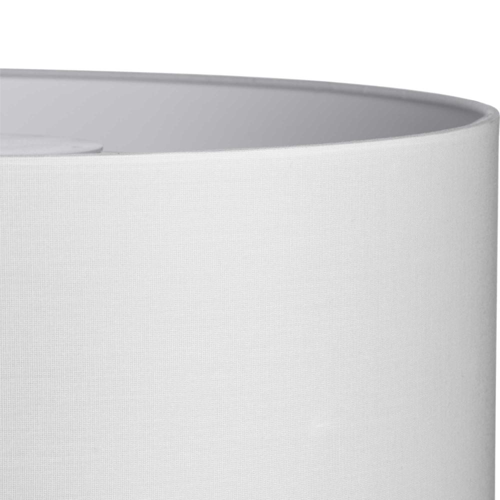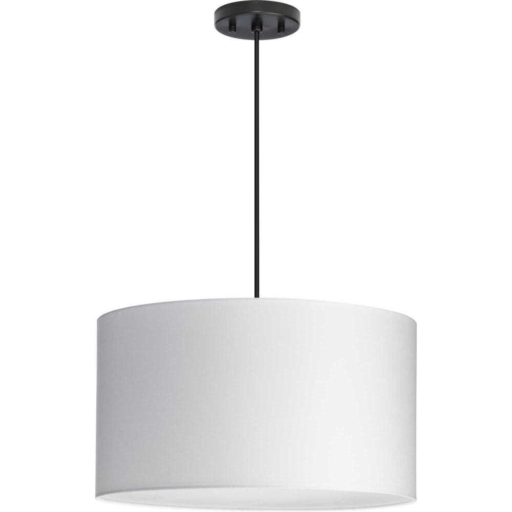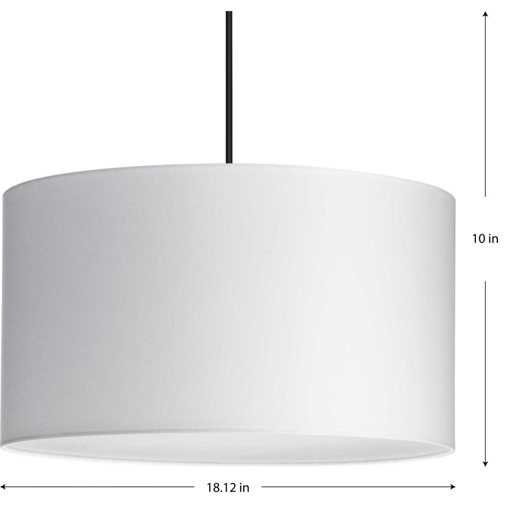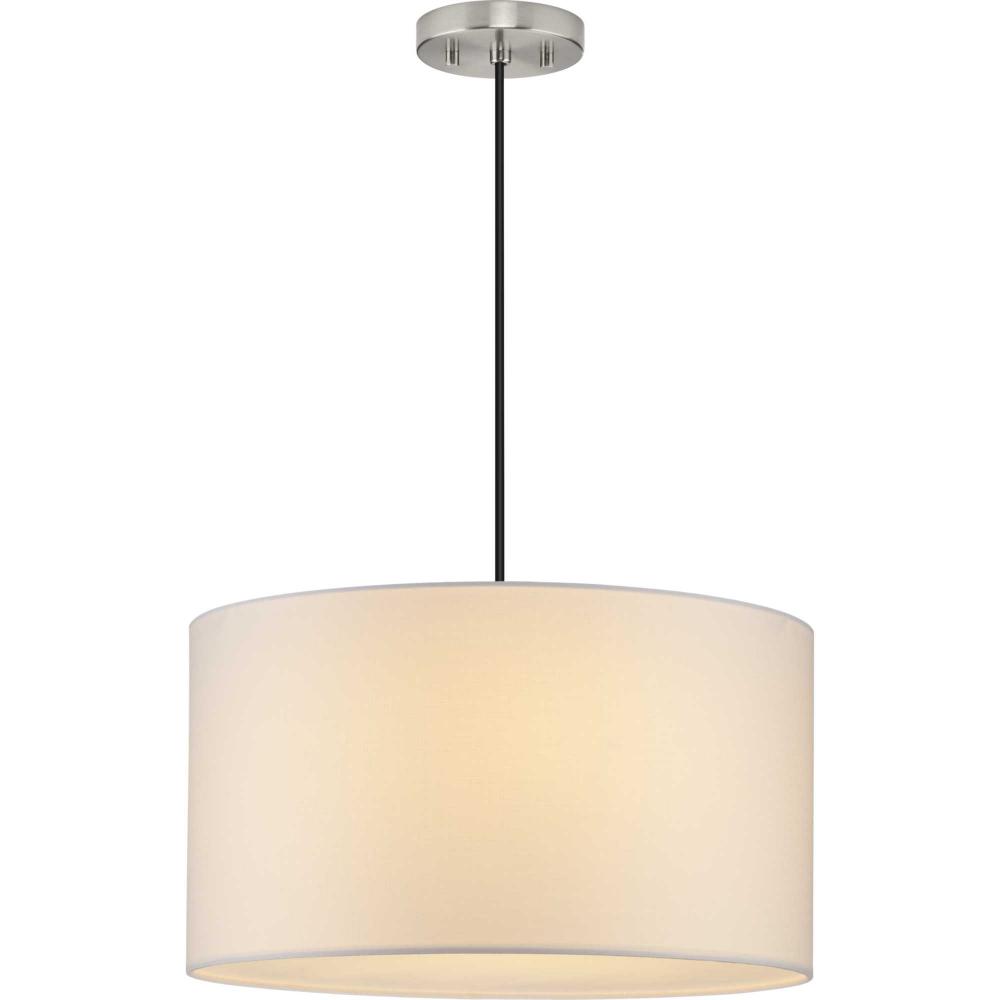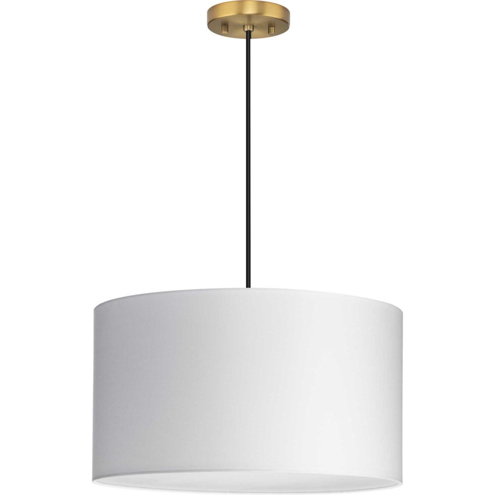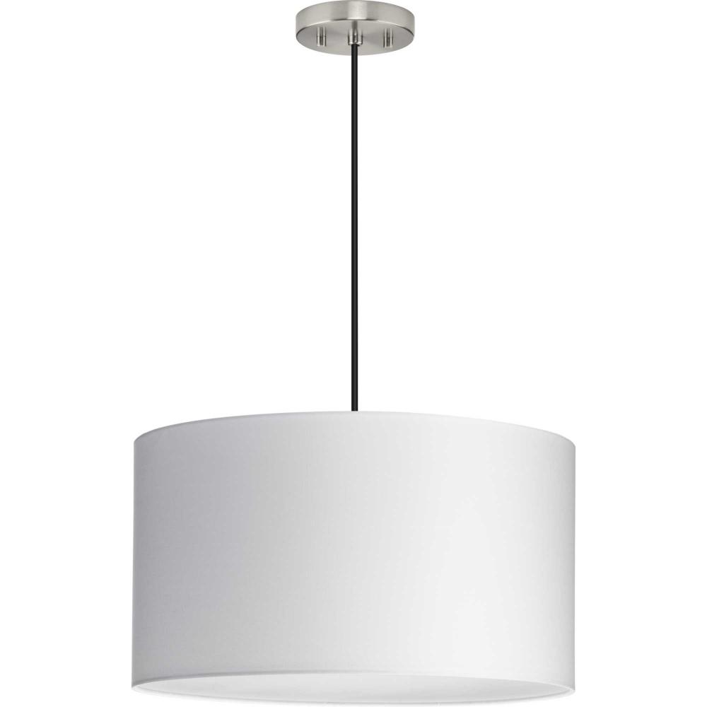 White Linen fabric drum shade, includes 3 canopies finished in Brushed Nickel, Matte Black and Vintage Brass, includes diffuser