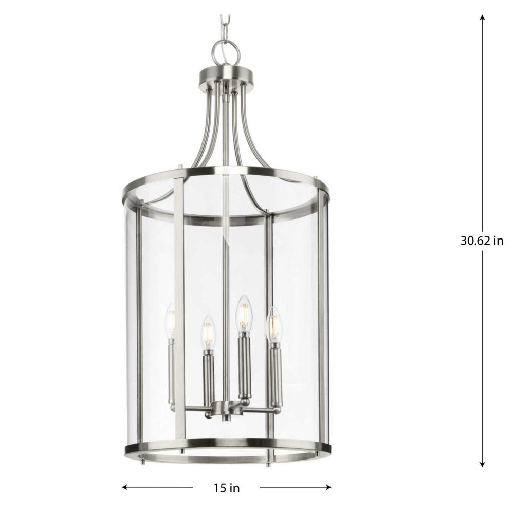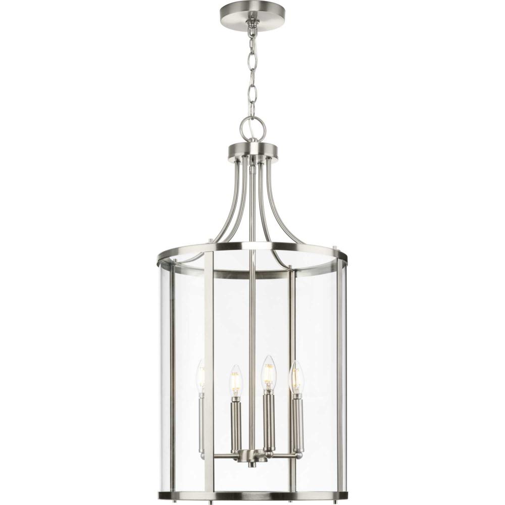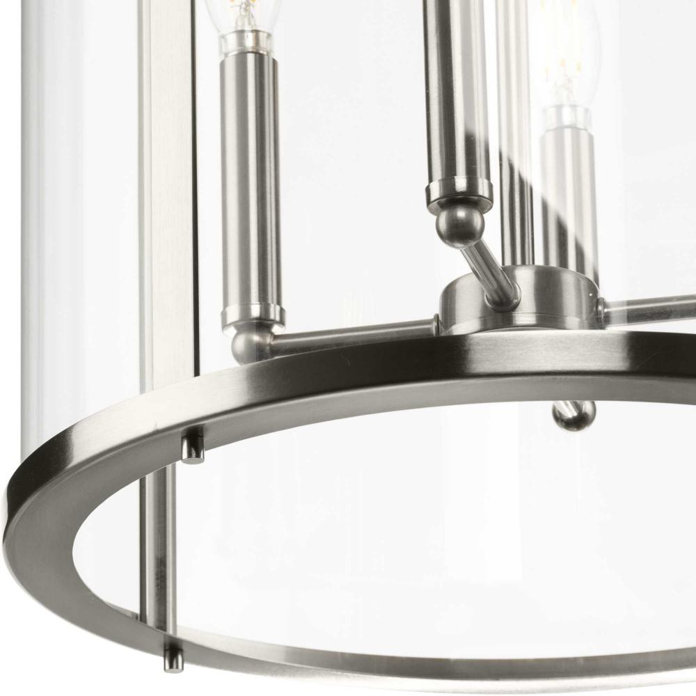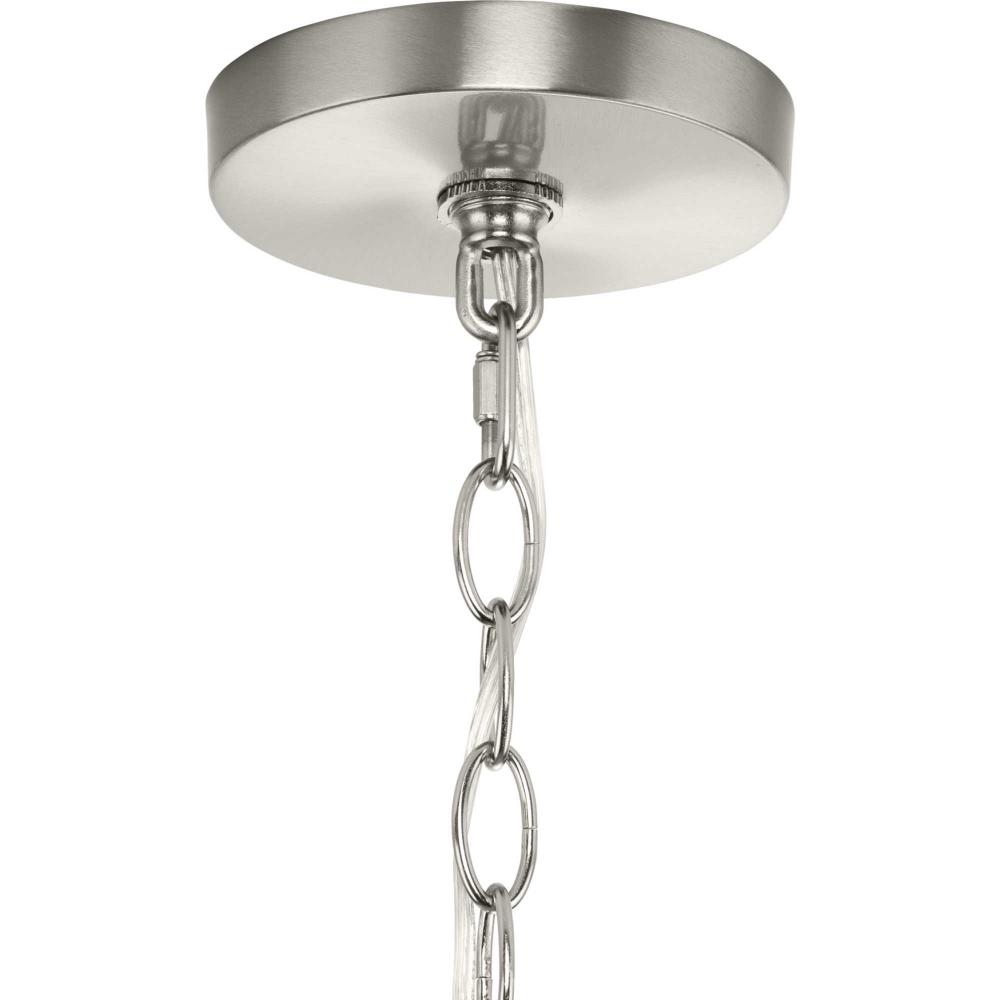 The fixture is coated with a subtle brushed nickel finish, adding a beautiful statement to halls and foyers