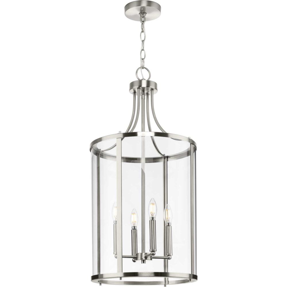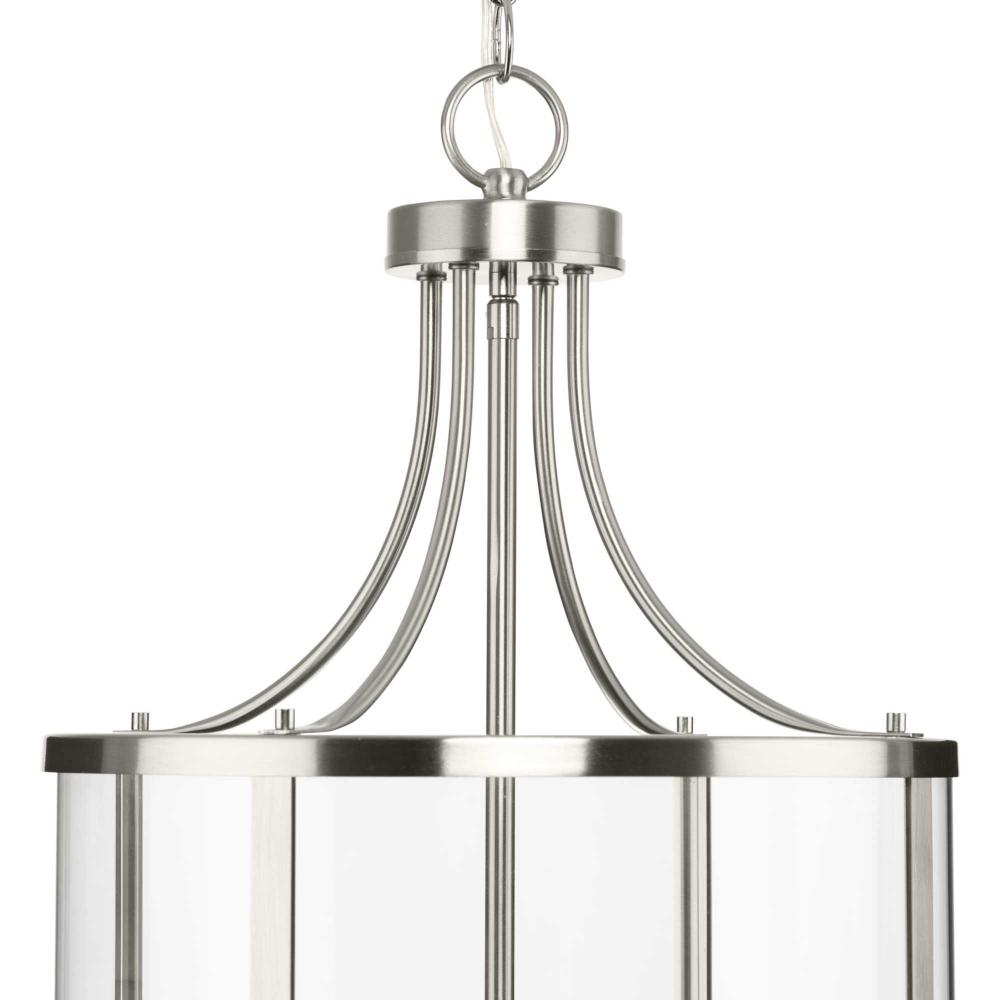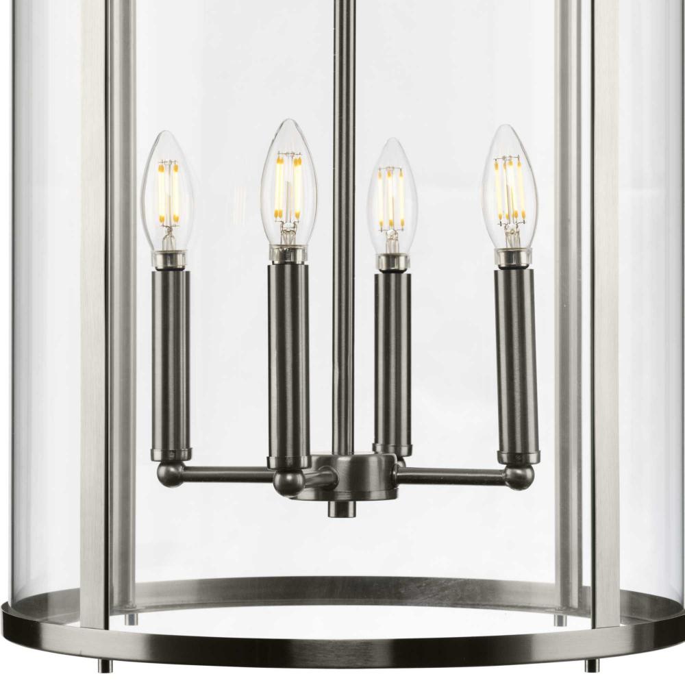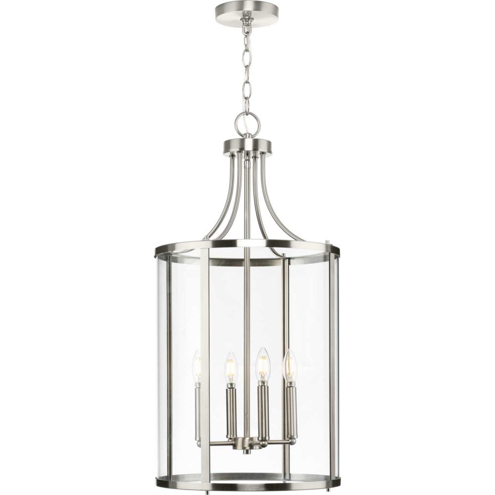 The fixture is coated with a subtle brushed nickel finish, adding a beautiful statement to halls and foyers